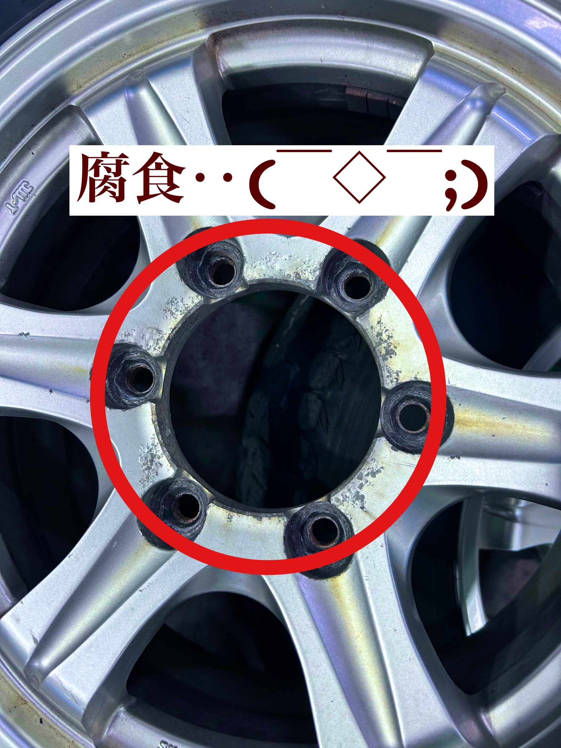 取り外したホイールを確認すると、センターボア付近やナットホール周辺に激しい**「腐食(白サビ)」**が見られました。