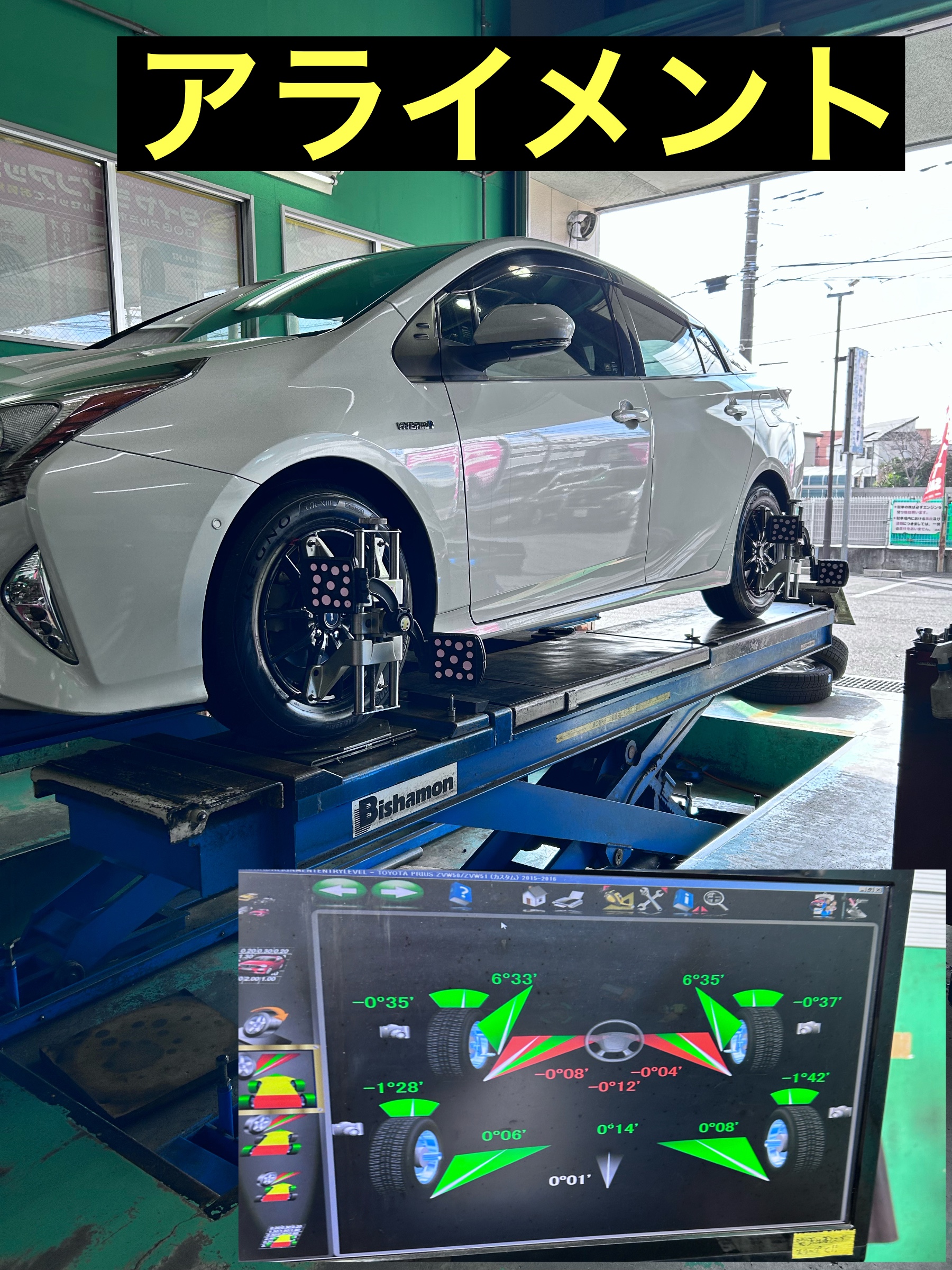 せっかくの新品タイヤ、その性能を100%発揮させるために**「アライメント(タイヤの取付角度)調整」**も実施いたしました。