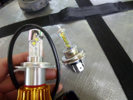 二枚目の左が今から取り付けるLEDバルブで、右が外したハロゲンバルブです!