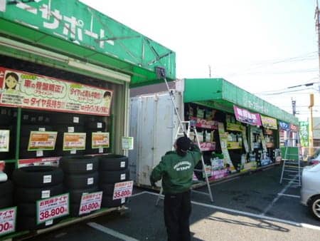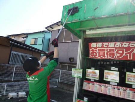 お店の外観を新しくするために、スタッフ谷地沼とアルバイト吉岡が頑張ってお掃除中です!