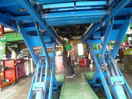普通の方は普段お目にかかれない車の真下ですが、車の下に潜るのが日常の僕たちがしっかり点検します!σ(´ω`*)笑