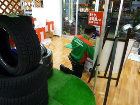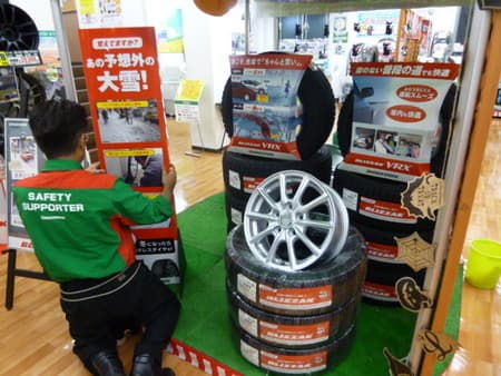タイヤ館鎌ヶ谷では店内入り口のコーナーにスタッドレスタイヤコーナーを新設中!