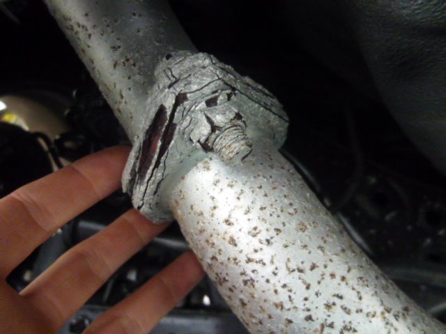 マフラーはどこかで耐熱塗装されていたようですが、サビが進行してしまって塗装ごとボロボロと剥がれ落ちる状態に・・・