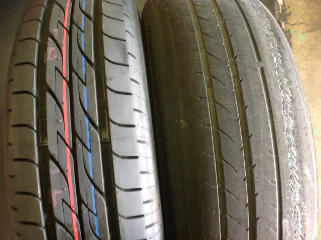 左が交換する新品タイヤで、右が今まで使っていたタイヤ・・・