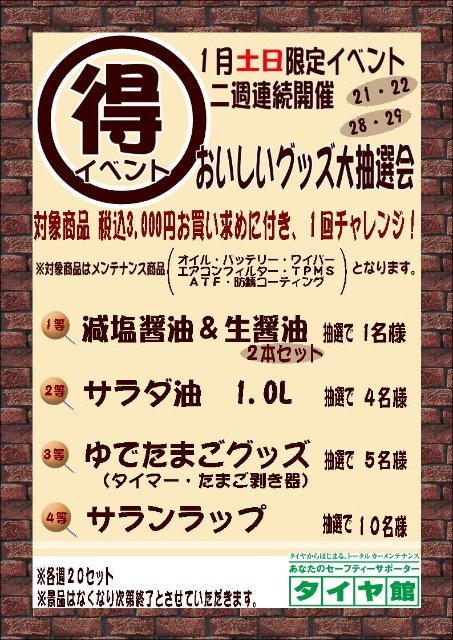 1月21・22日と1月28・29日の二週連続で、おいしいグッズの当たる抽選会を開催しま~す!ヾ(^▽^ヾ)