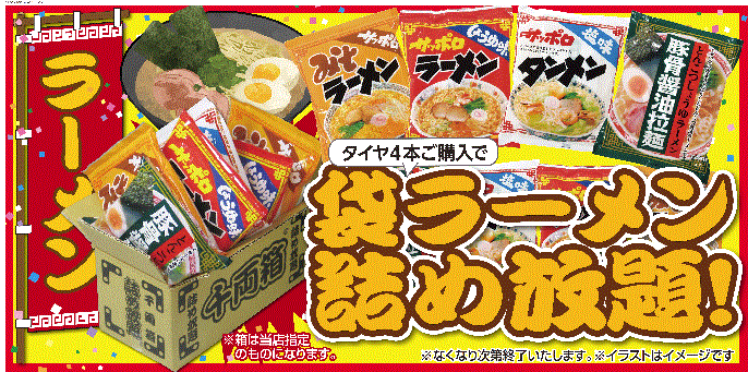 3/4(土)~3/12(日)の間にタイヤ4本購入頂いたお客様に袋ラーメン詰め放題の春の大商談会第二弾を実施します。