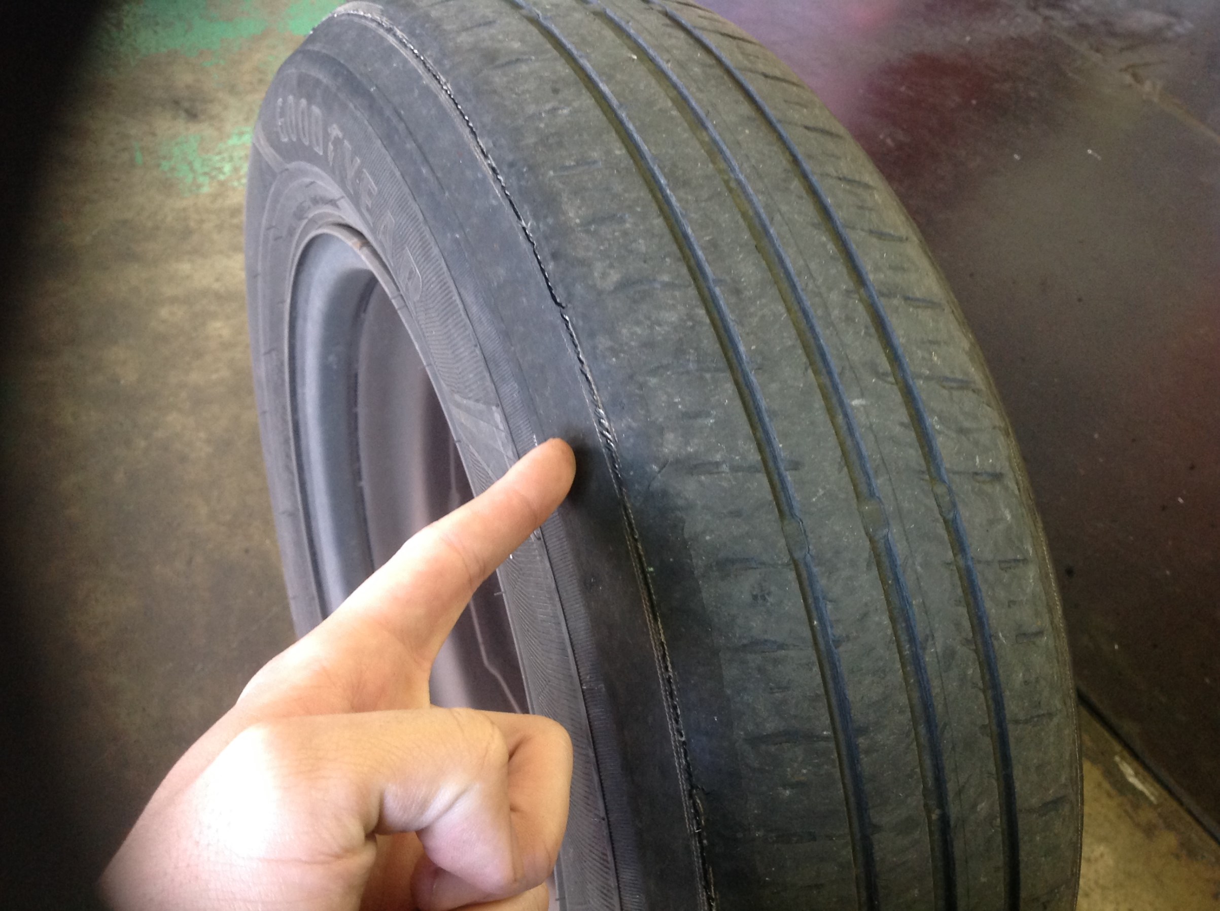 タイヤの減りが限界を超えていたのに気付かず、タイヤの骨組みまで削れて破裂してしまったパターンですねil||li_| ̄|○ il||li
