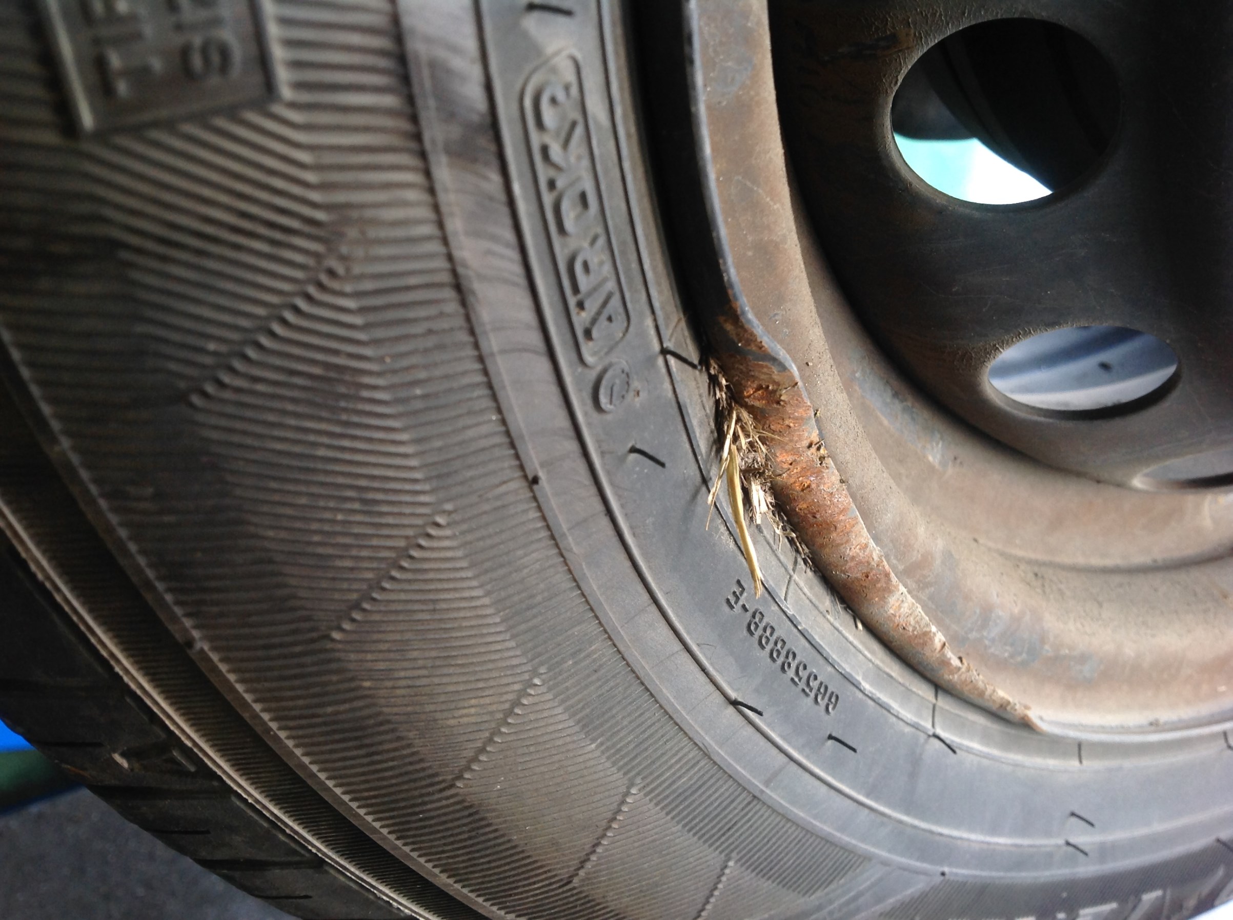 左前タイヤもバースト寸前!骨組みが露出しています!Σ(´Д` ;)