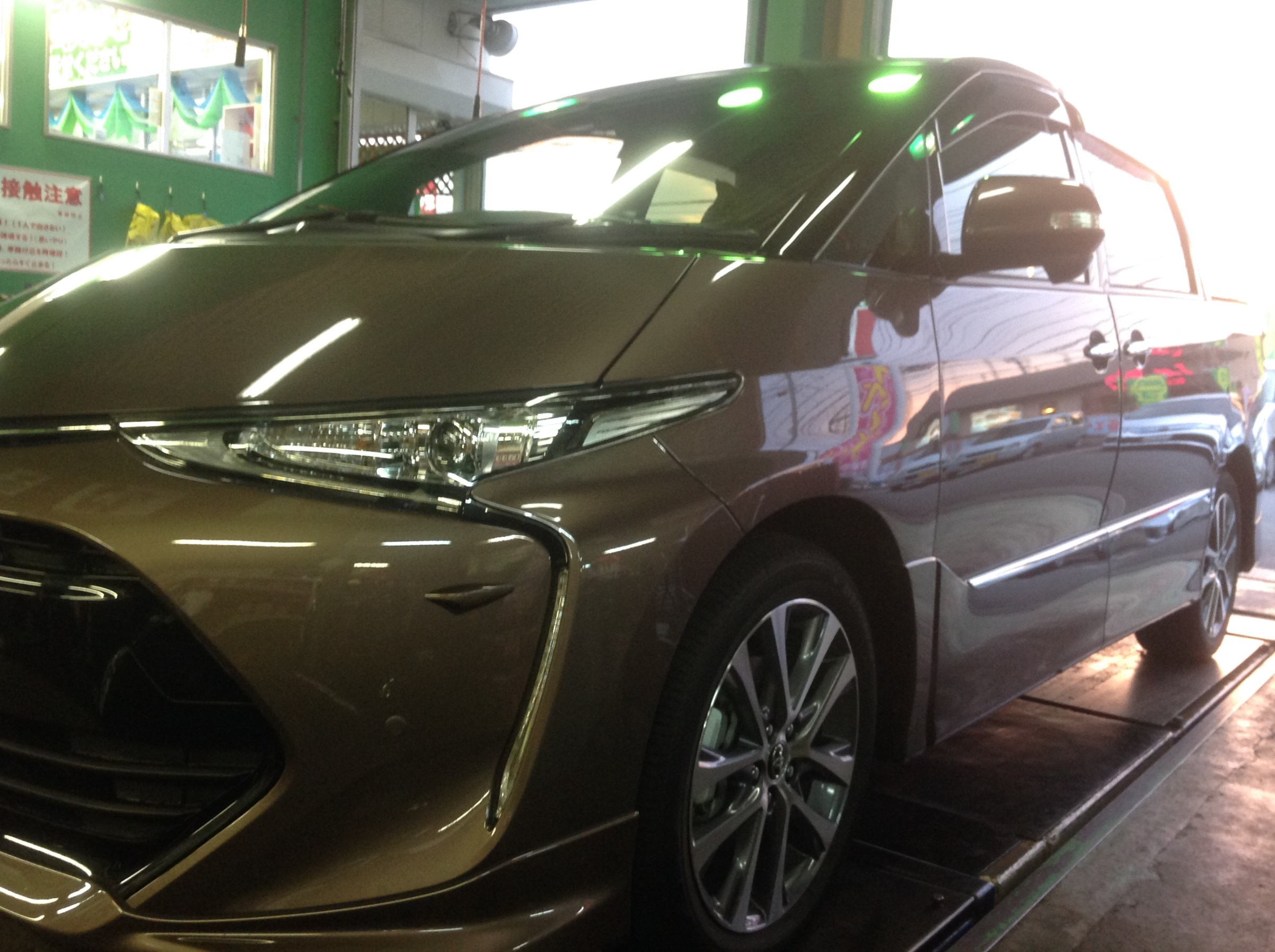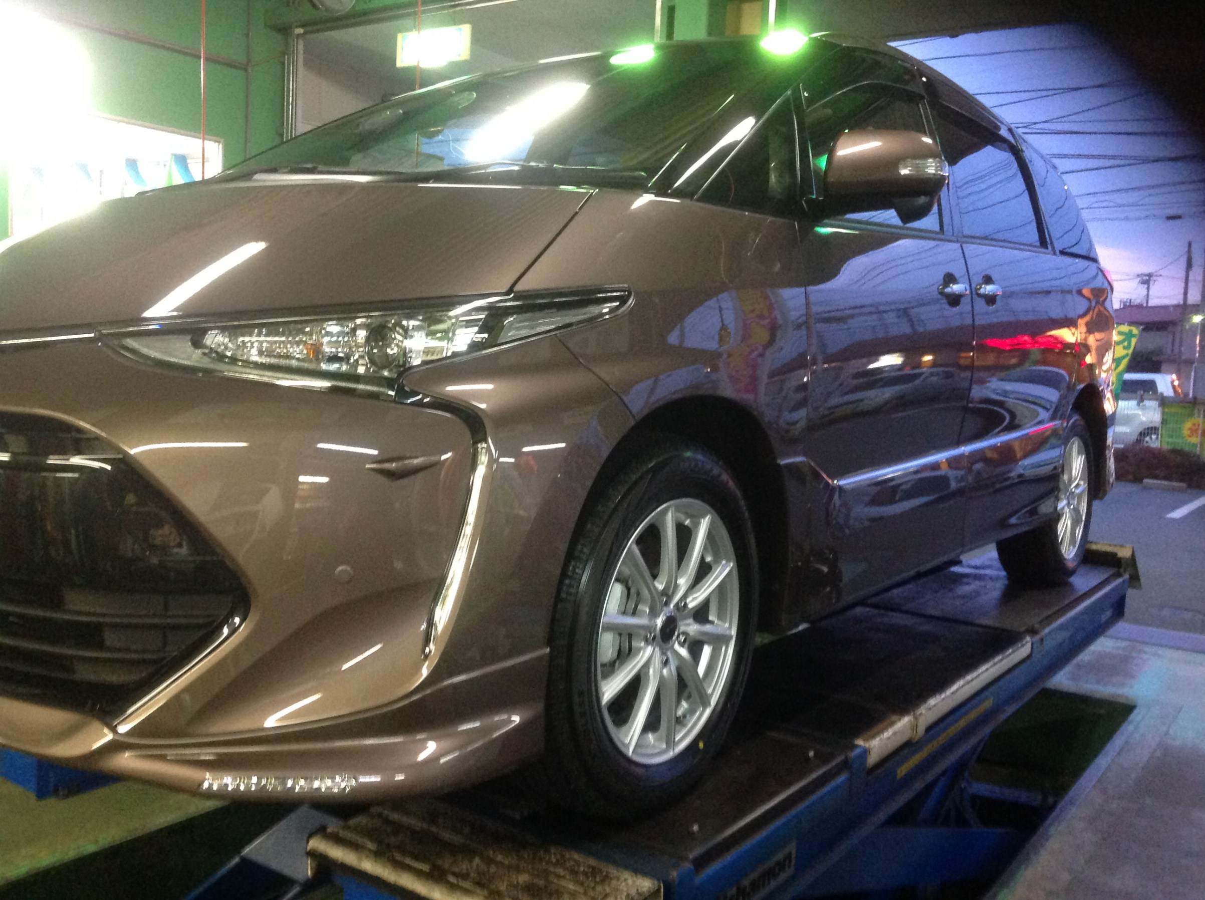 そんな天気の移り変わりが激しい中、本日、当店では、トヨタ「現行エスティマ」にスタッドレスタイヤのお取り付けをしました!!