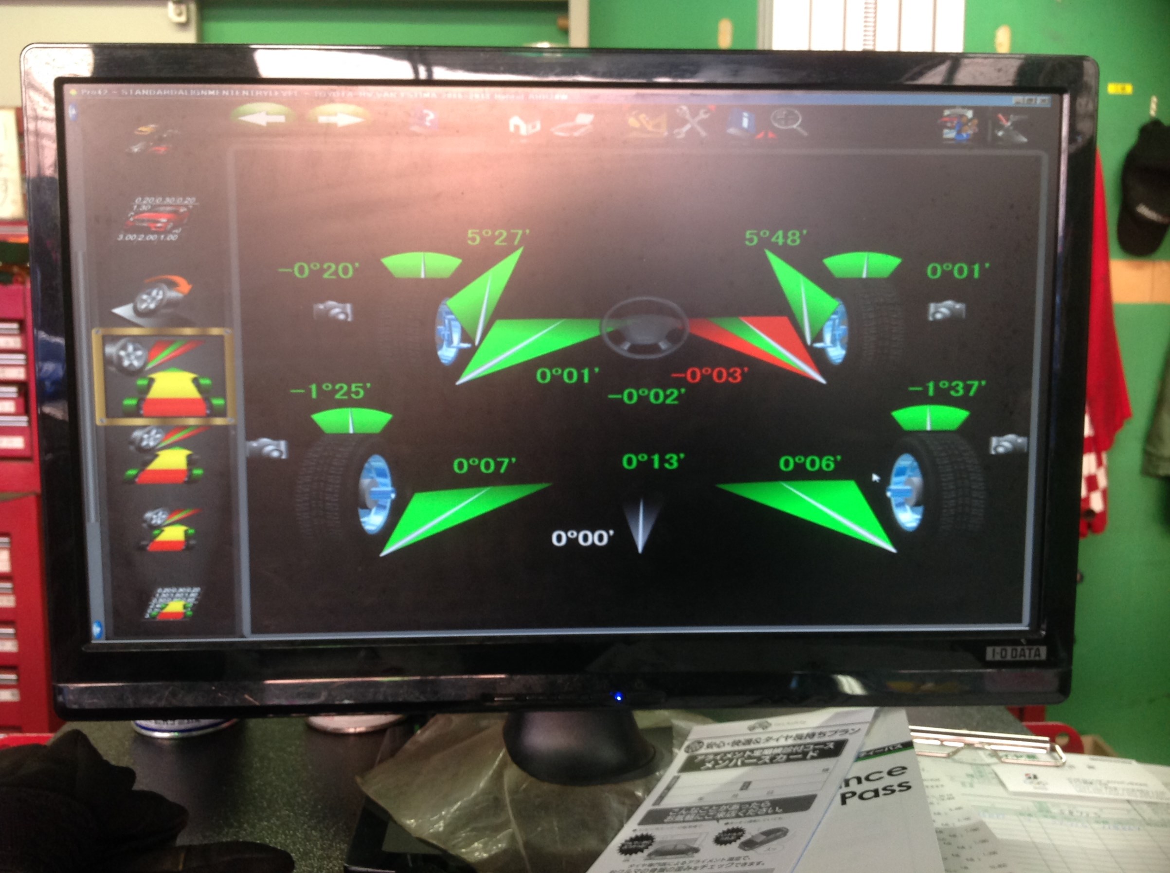 そこまで大きなズレは無く、右側のタイヤが基準値より、ちょっとだけがに股になっていたので、そこを基準値にあわさせて頂き、納車させて頂きました(^^)/