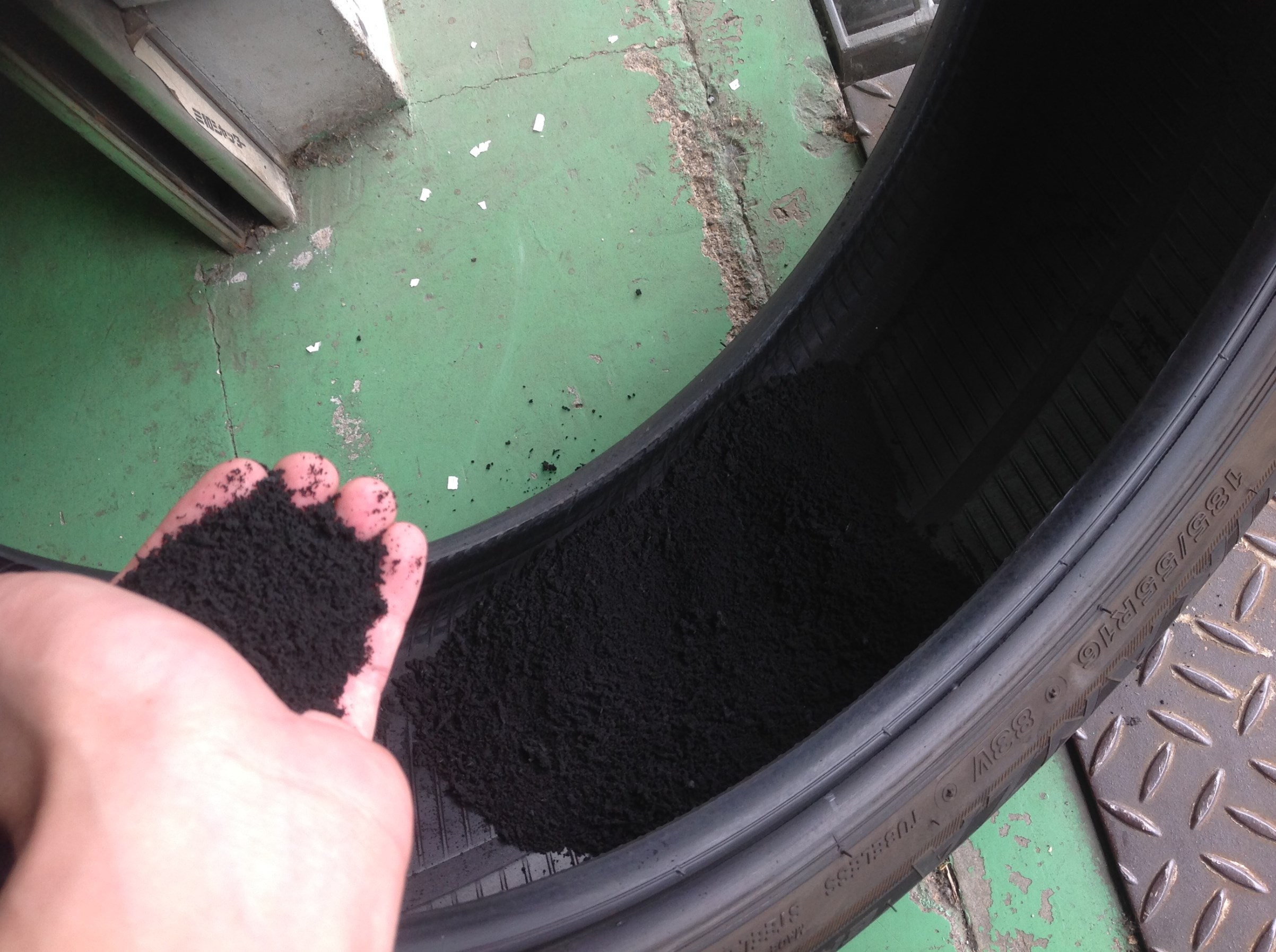 空気が抜けて車の重さに耐えられなくなったタイヤくんは、ホイールと地面の間ですり潰されて中身がこんなにズタボロになり・・・見ての通り剥がれたゴムのカスが大量な状態でした・・・