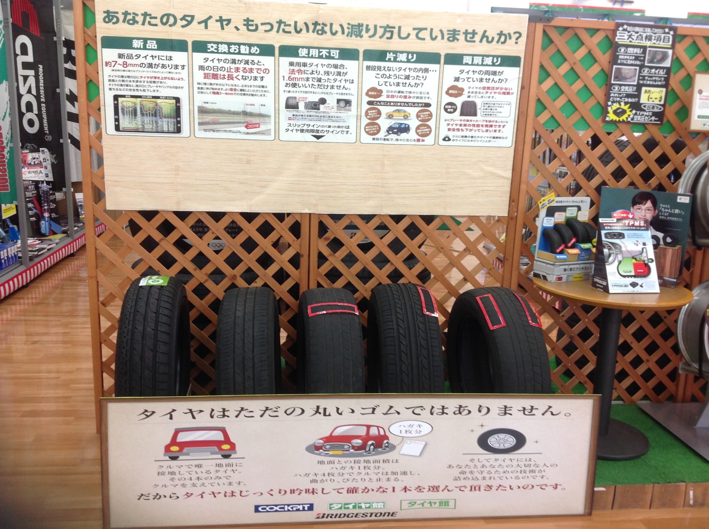 プロのスタッフが、しっかり点検、色んな減り方をしたタイヤ展示を使い、どういう状態だと交換が必要になるのかを分かりやすくご説明させて頂きます!!