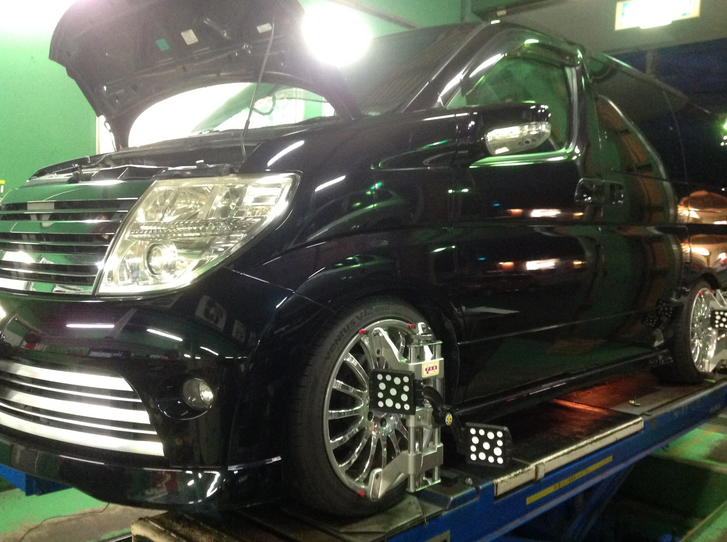 本日最後の作業は車高調を他店でお取り付けしたエルグランドのご予約アライメント調整!