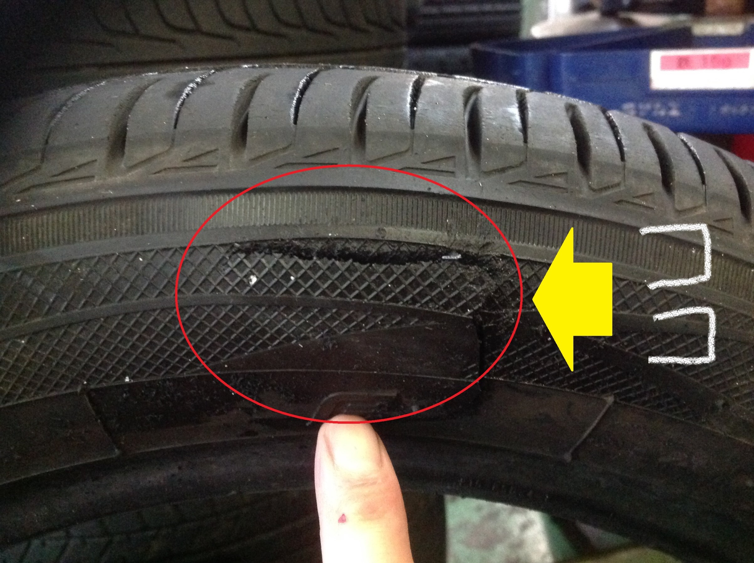 赤い丸に囲まれた部分、縁石にぶつけてしまい、パックリタイヤに穴があいてしまってました(><)