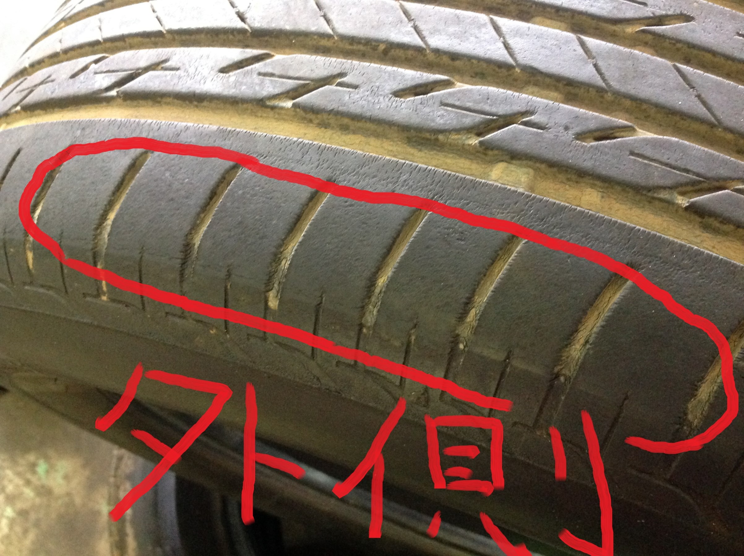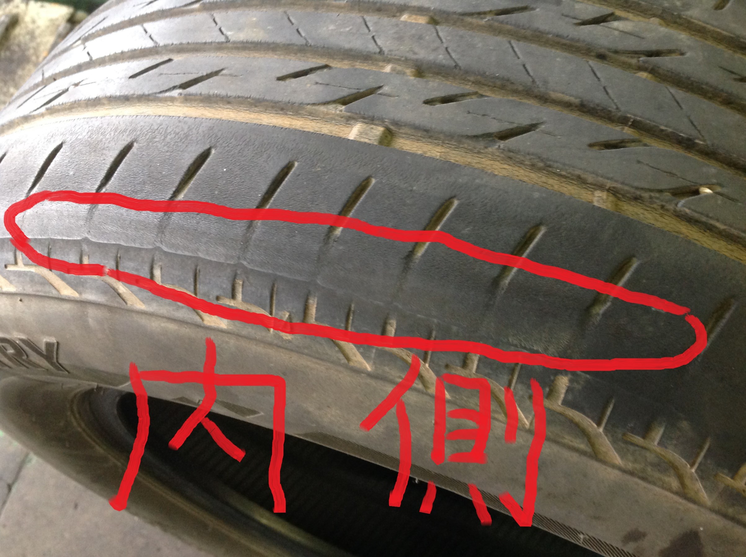 タイヤの角度がガニ股ですと、タイヤの内側を引きずりながら走行するようになってしまって上記写真のような変な減り方をしてしまうんです《(;´Д`)》