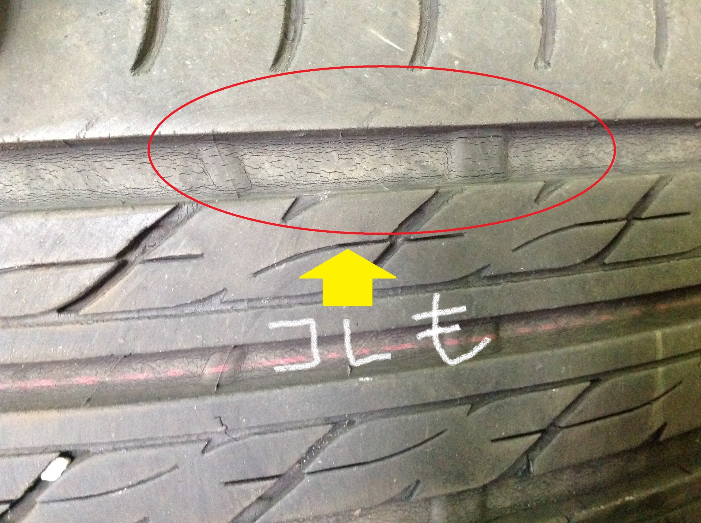 タイヤが2013年製なので丸4年経過、溝はもう少し使える状態なので、まずはお見積もりを渡させて頂いたのですが、オーナー様が隣に止まっているお車のタイヤと自分の車のタイヤを見比べた際、自分のタイヤのヒビ割れがやはり気になり交換にご来店頂きました。