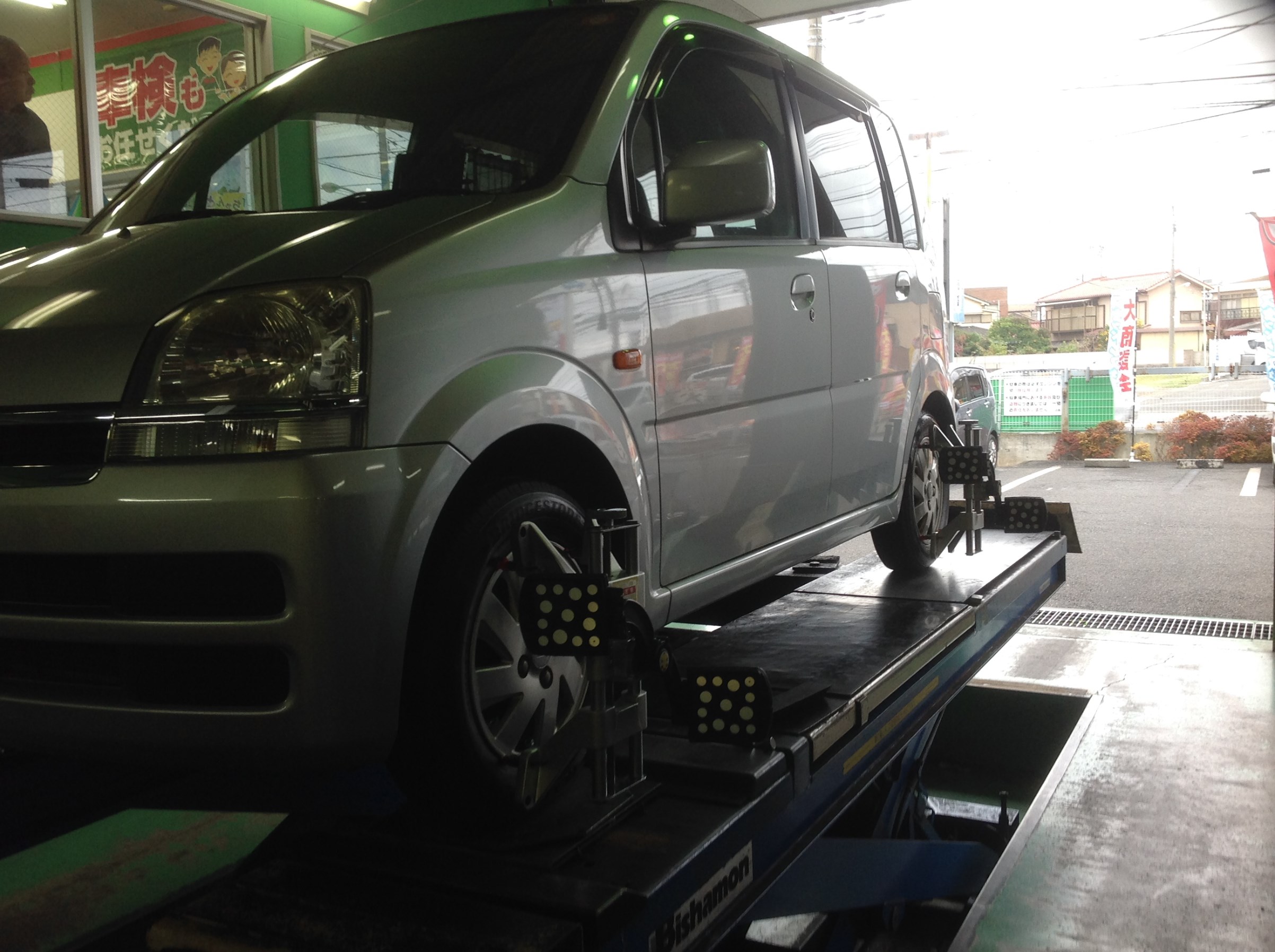 お車の乗り換えをご検討されていても、乗り換えるまではしっかり安心して乗りたいというのと、左前輪をぶつけてしまったとの事で、しっかりタイヤの取り付け角度のズレが出ていないかチェック!!