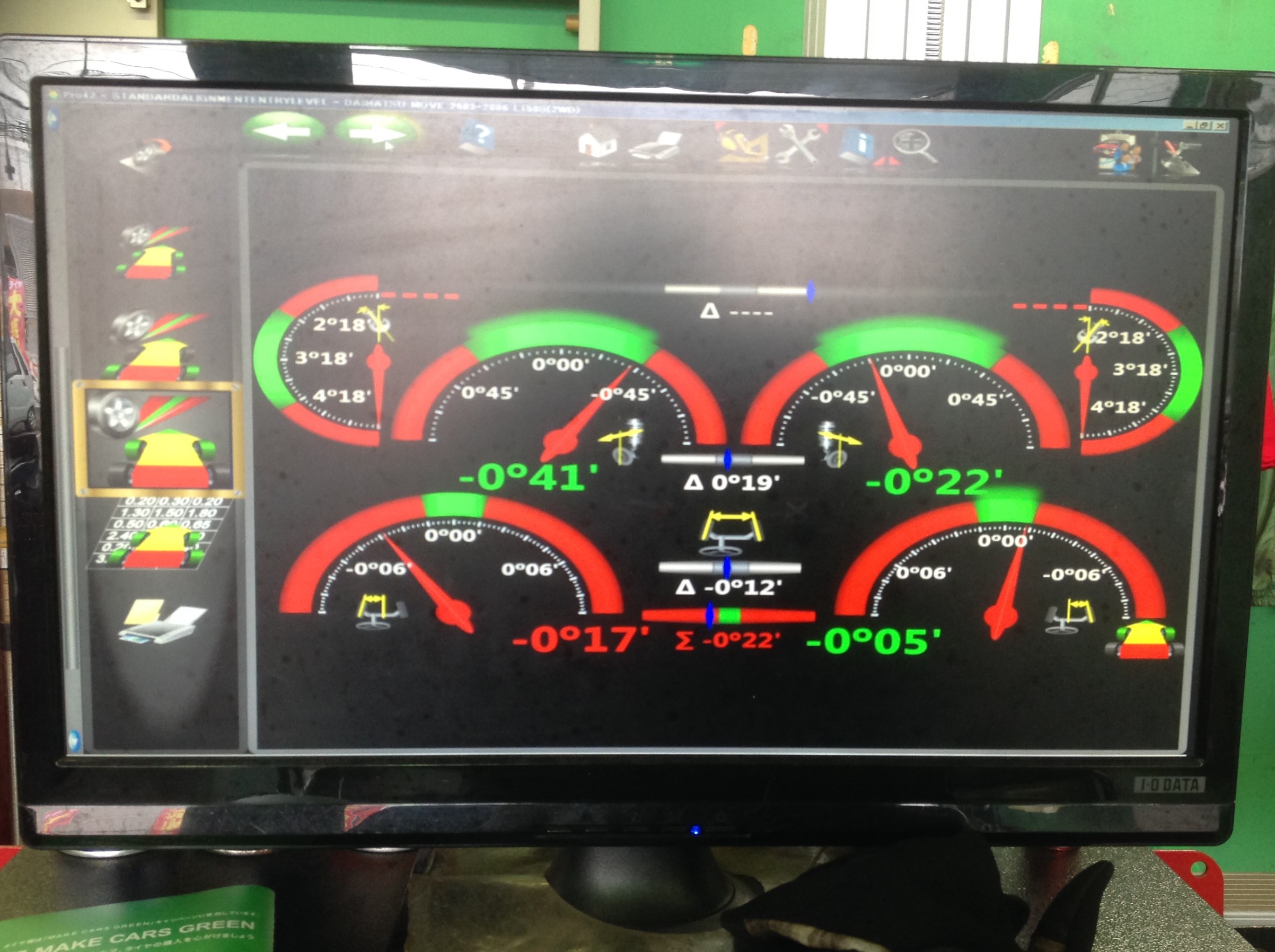 左前輪が基準値よりも大幅にがに股になっていたので、しっかり左右とも同じ角度、基準値内に調整させて頂いた納車させて頂きました(^^)/