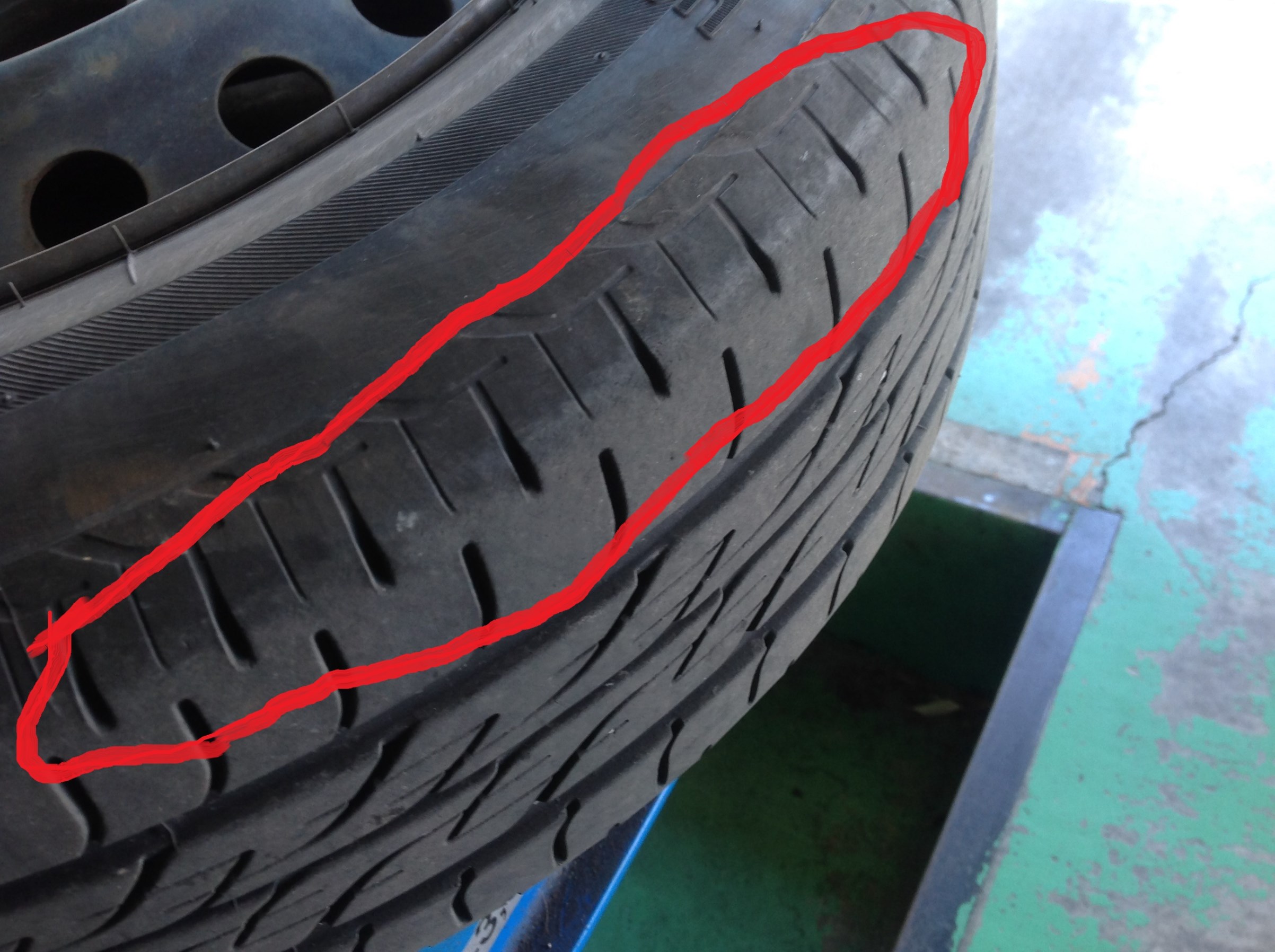 前のタイヤは、前輪駆動車なので前輪にのみパワーが伝わったり、ハンドルを切ったり、ブレーキをかけると前のめりになって加重がかかったりして負担が大きいんです!