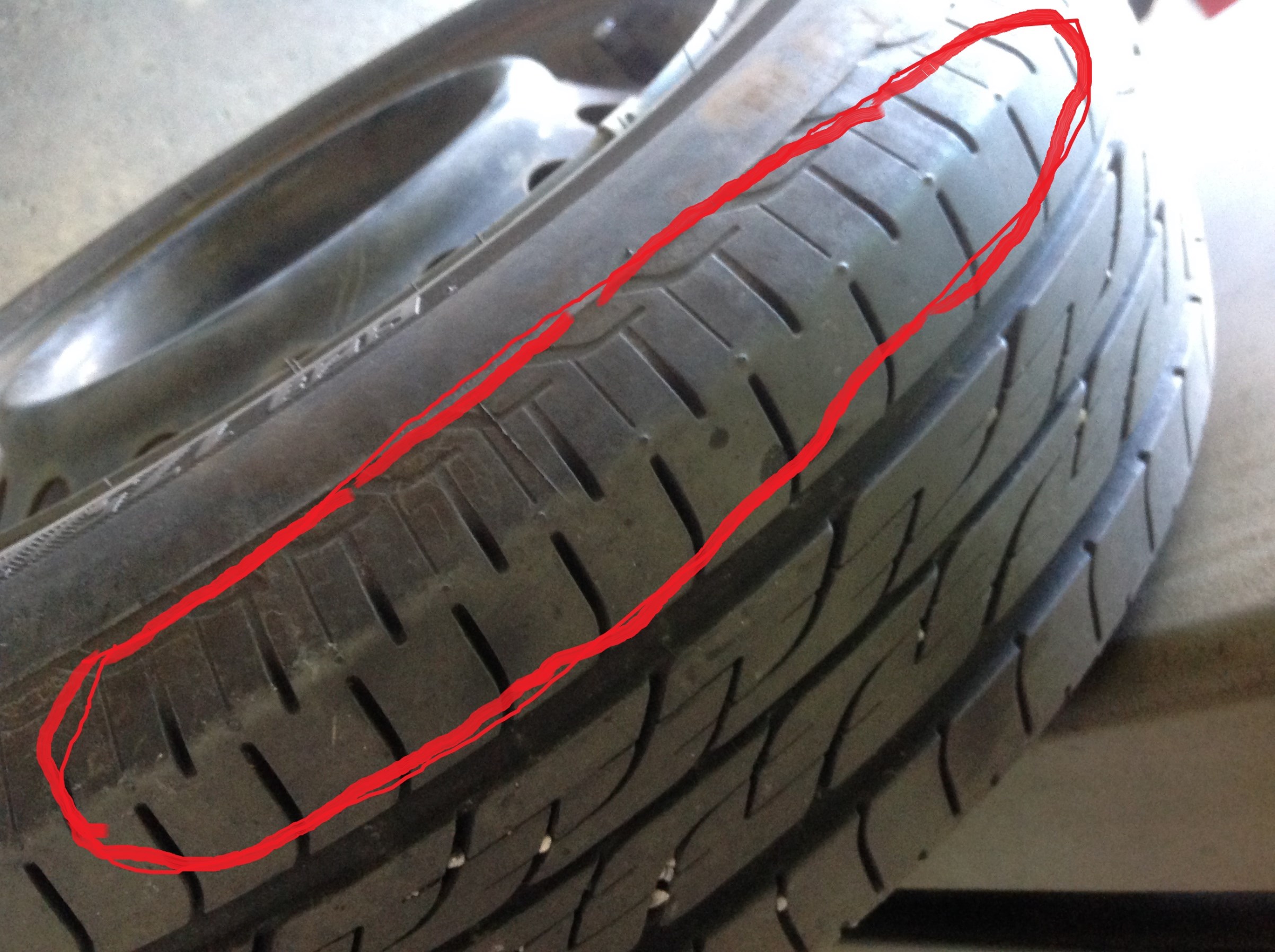 赤丸の中の状態を見ると、後ろのタイヤにはタイヤの角部に小さな凸があって前のタイヤにはそれが無いのがお分かりいただけますでしょうか?(?_?)
