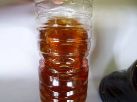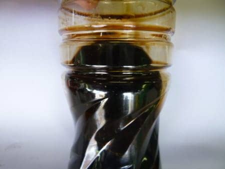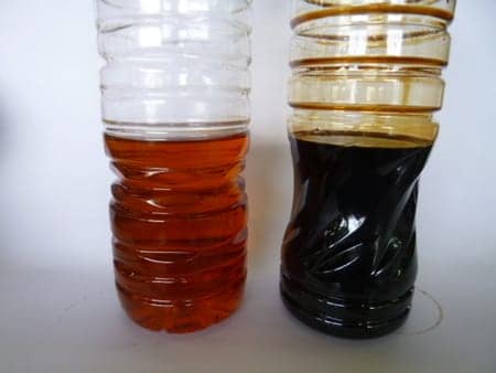 1枚目の写真が交換前のオイル(約8,000km使用)で、2枚目の写真が新しいオイルです。