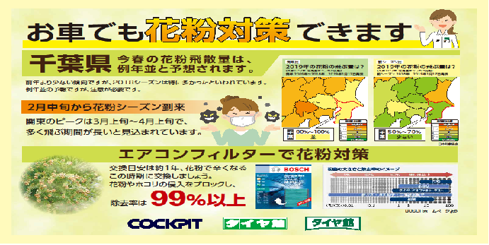 花粉対策!エアコンフィルター交換やってます! ポスト 2019年3月12日 花粉シーズン到来!! 実はクルマにもエアコン用のフィルターが装着されていることはご存知ですか?(一部非装着車種あり) フィルターが汚れていると車内の空気も悪くなり、エアコンの効きや燃費にも影響がでることがあります。 早めの対策をおこなって、今年の花粉シーズンを乗り切りましょう!! 無料でエアコンフィルターの点検を行っています! 車種によってはお取寄せになりますのでご了承下さい。 カテゴリ:お知らせ