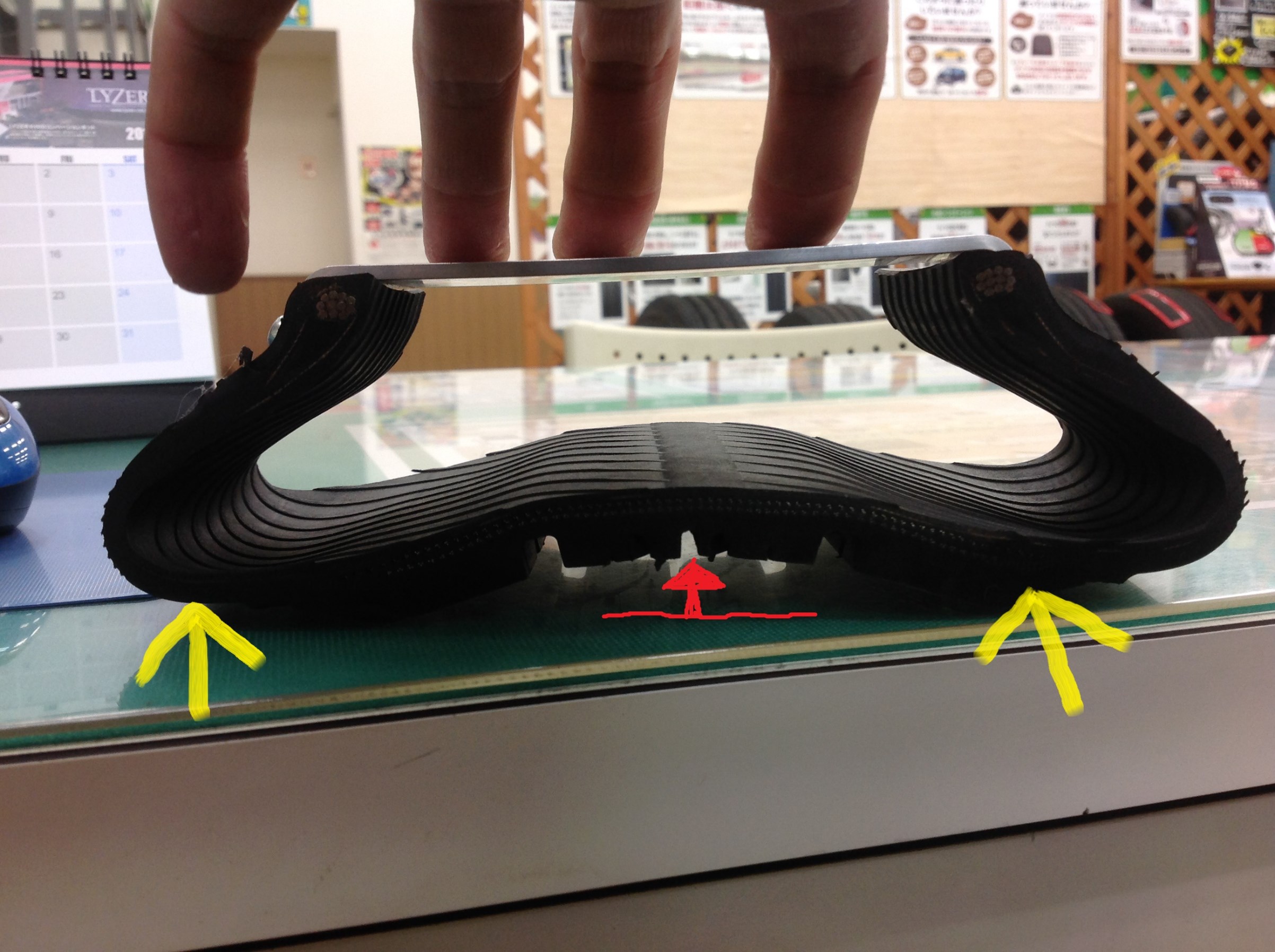 空気圧が低下した状態で車の重さが伸し掛かると、写真の赤矢印のようにタイヤの真ん中が浮いてしまいます!