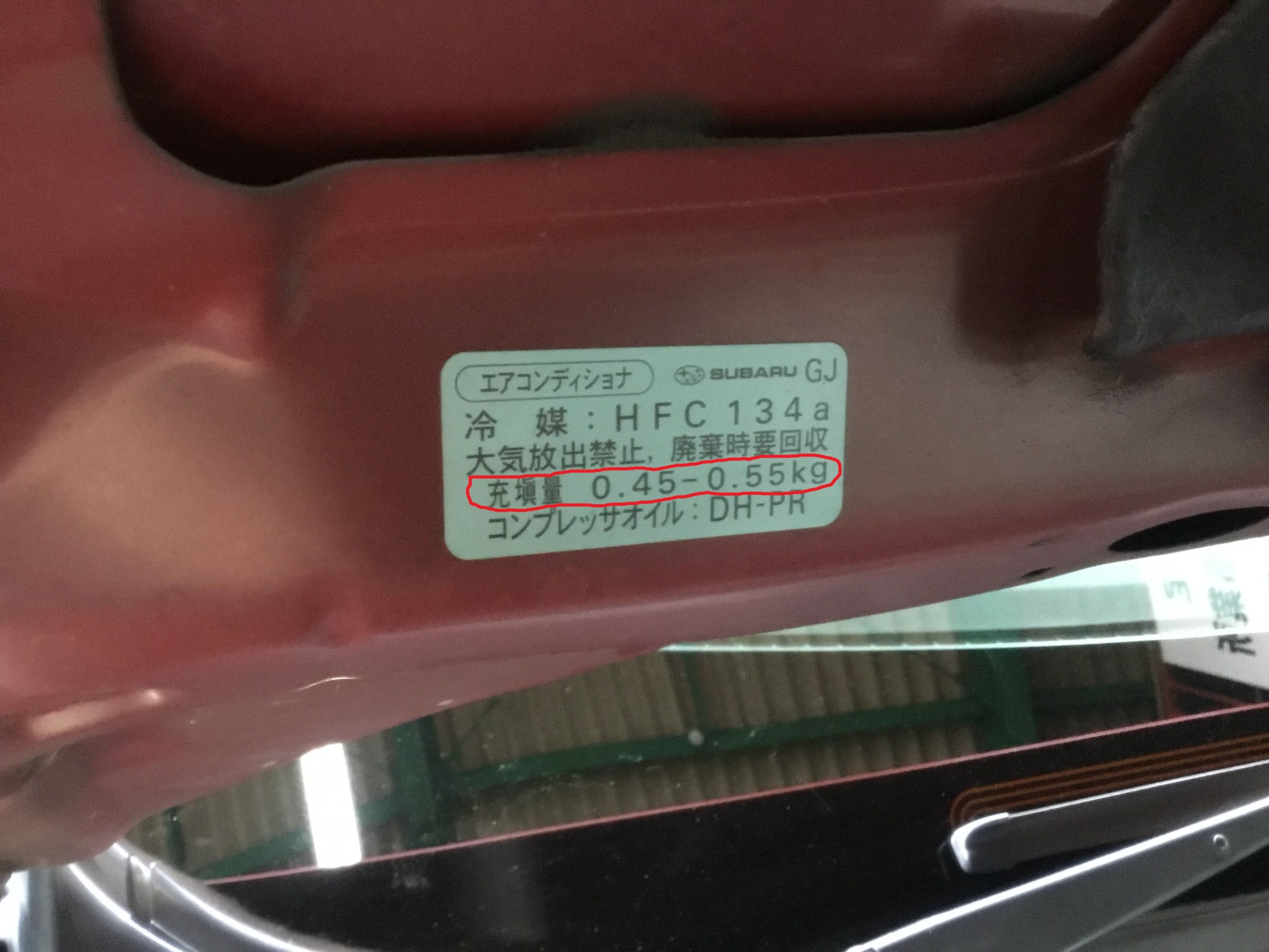 このインプレッサのエアコンガスの基準充填量は450g~550g!!