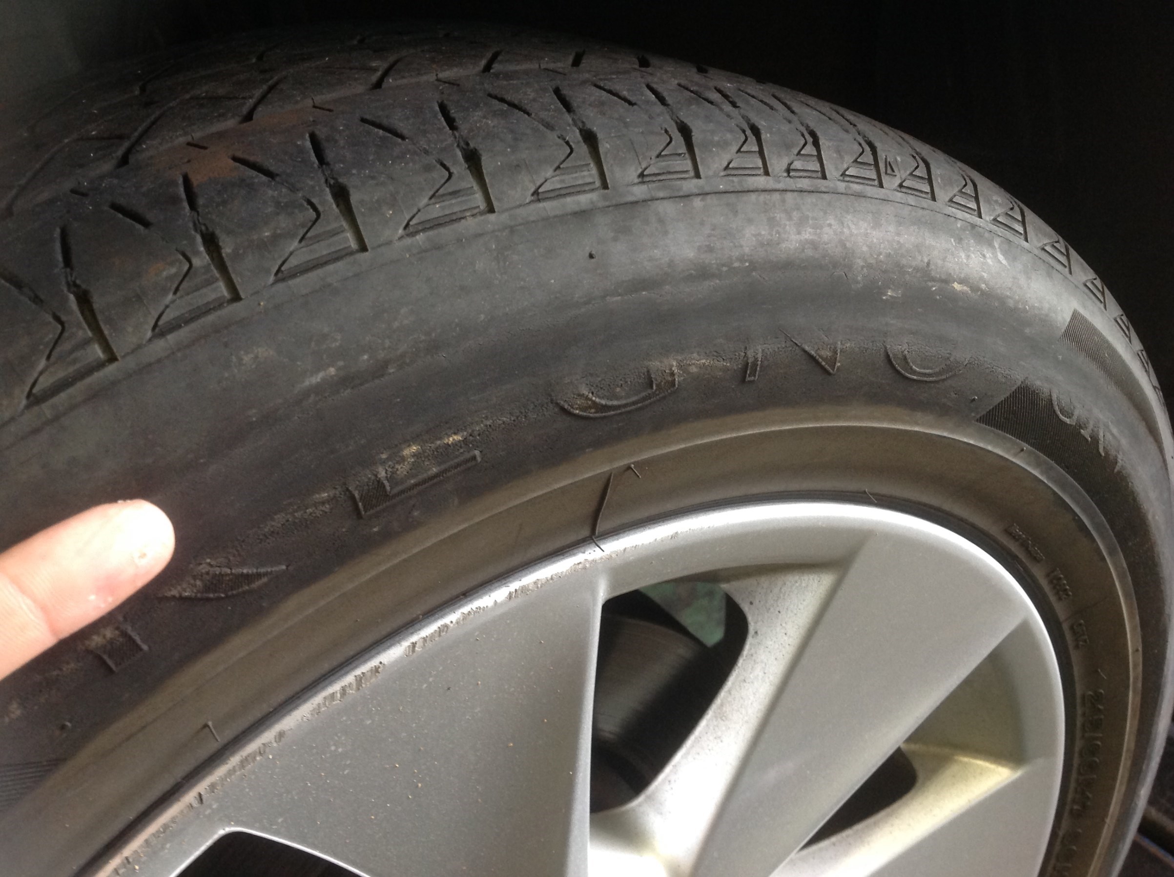 空気圧がゼロだと、車の重さと地面の間でタイヤがすり潰されてしまってこういう状態になります・・・