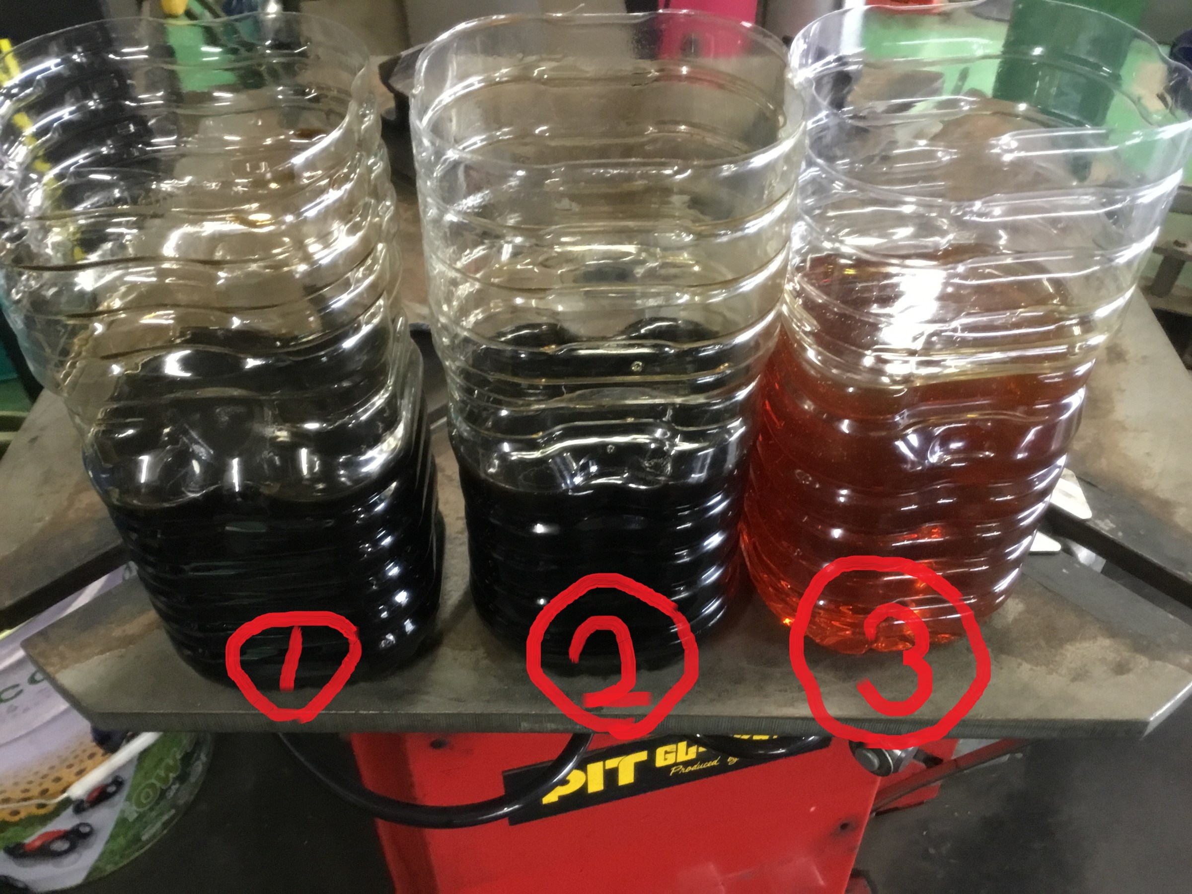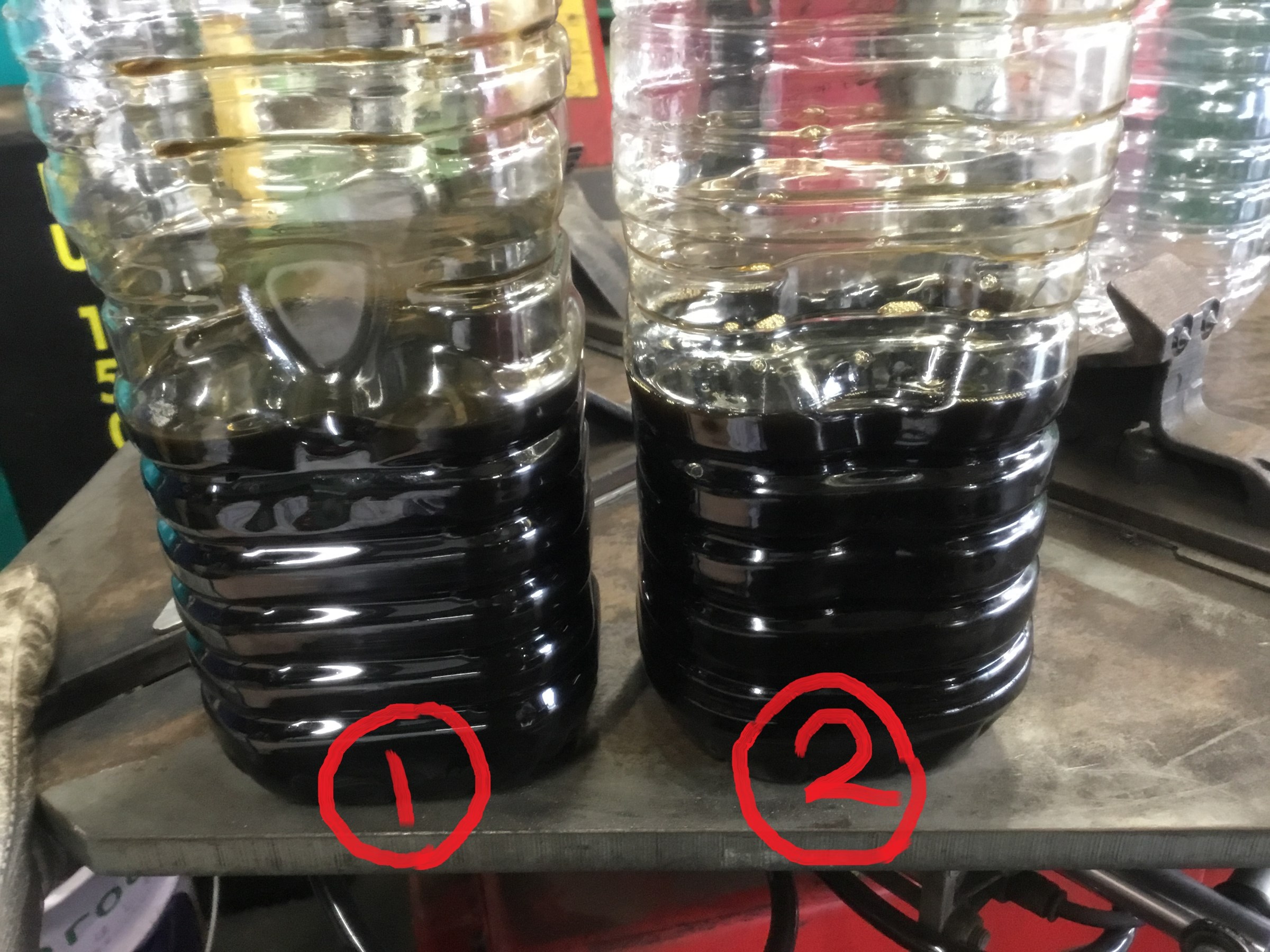 1が最初に抜き取ったエンジンオイルで、2がフラッシング後のフラッシングオイル!