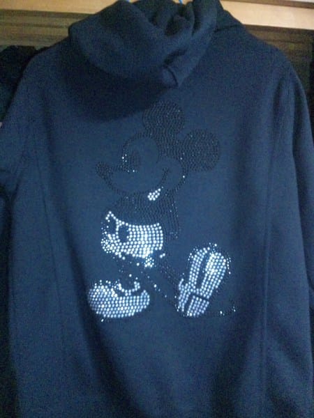 写真にも載せている、ラインストーンで描かれたミッキーがバックに入っているパーカーです。