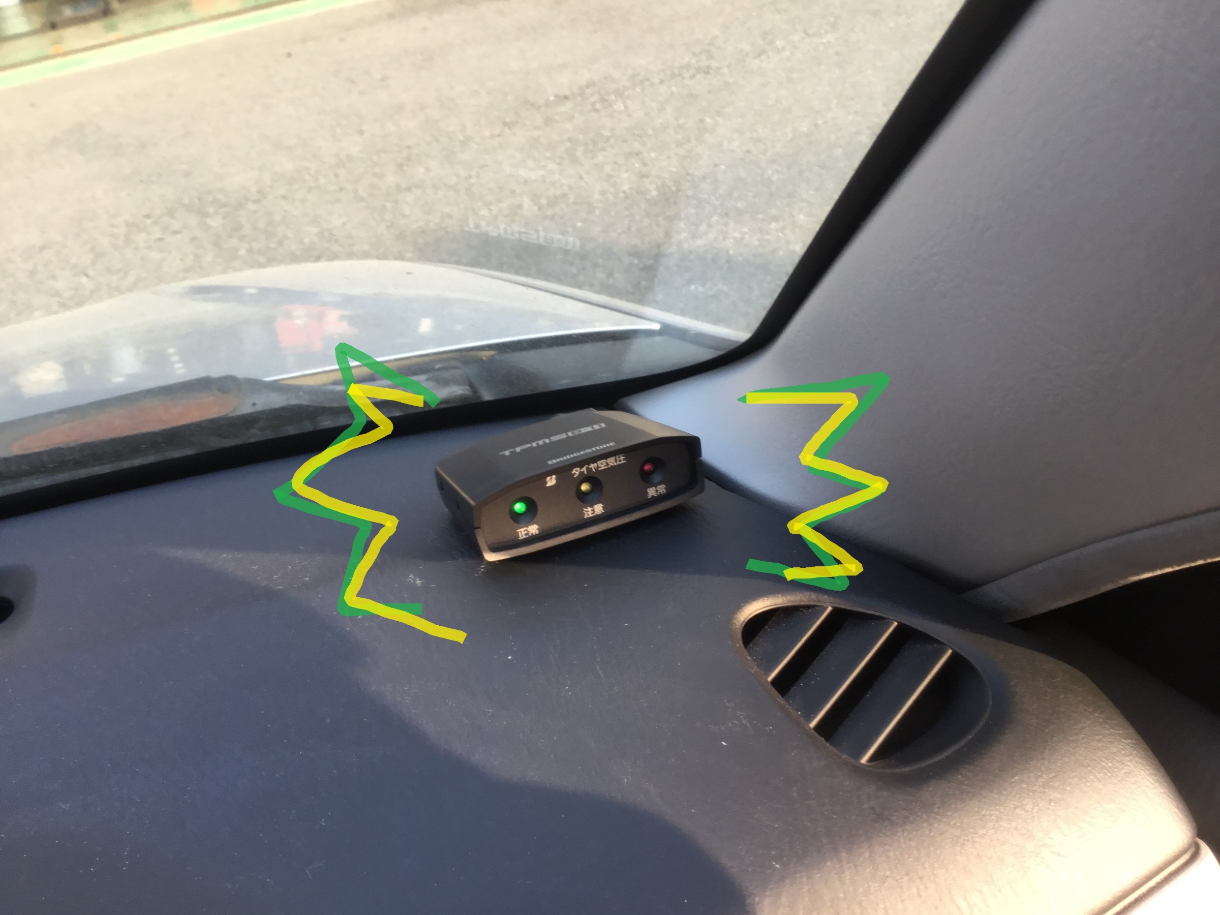 タイヤの空気圧状態が信号色で表示されるモニターは、視認性がよく運転の邪魔になりにくいダッシュボードの右端に装着っ!!