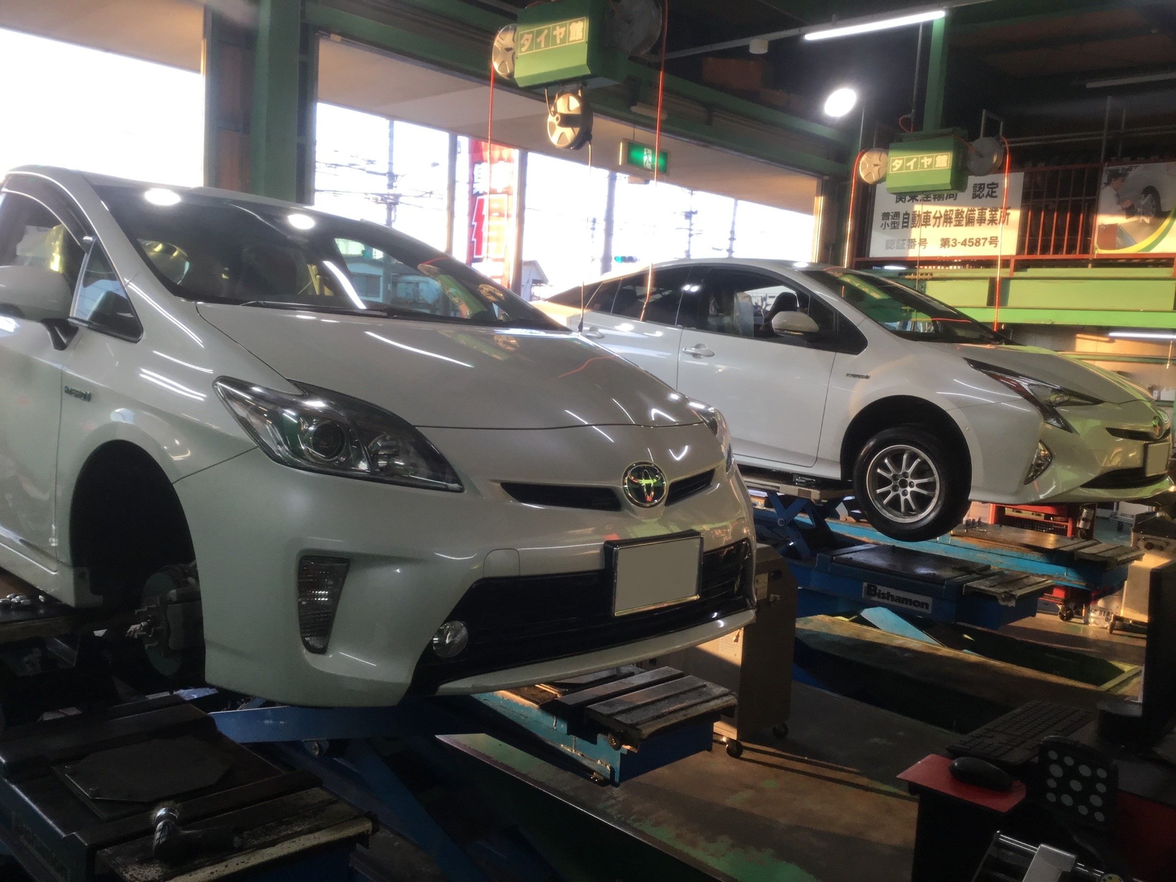 ただ今の時期は、冬時期にスタッドレスタイヤを装着されていた方が夏用タイヤに戻す“脱着”という作業で大変込み合う時期ですっ!(;´∀`)