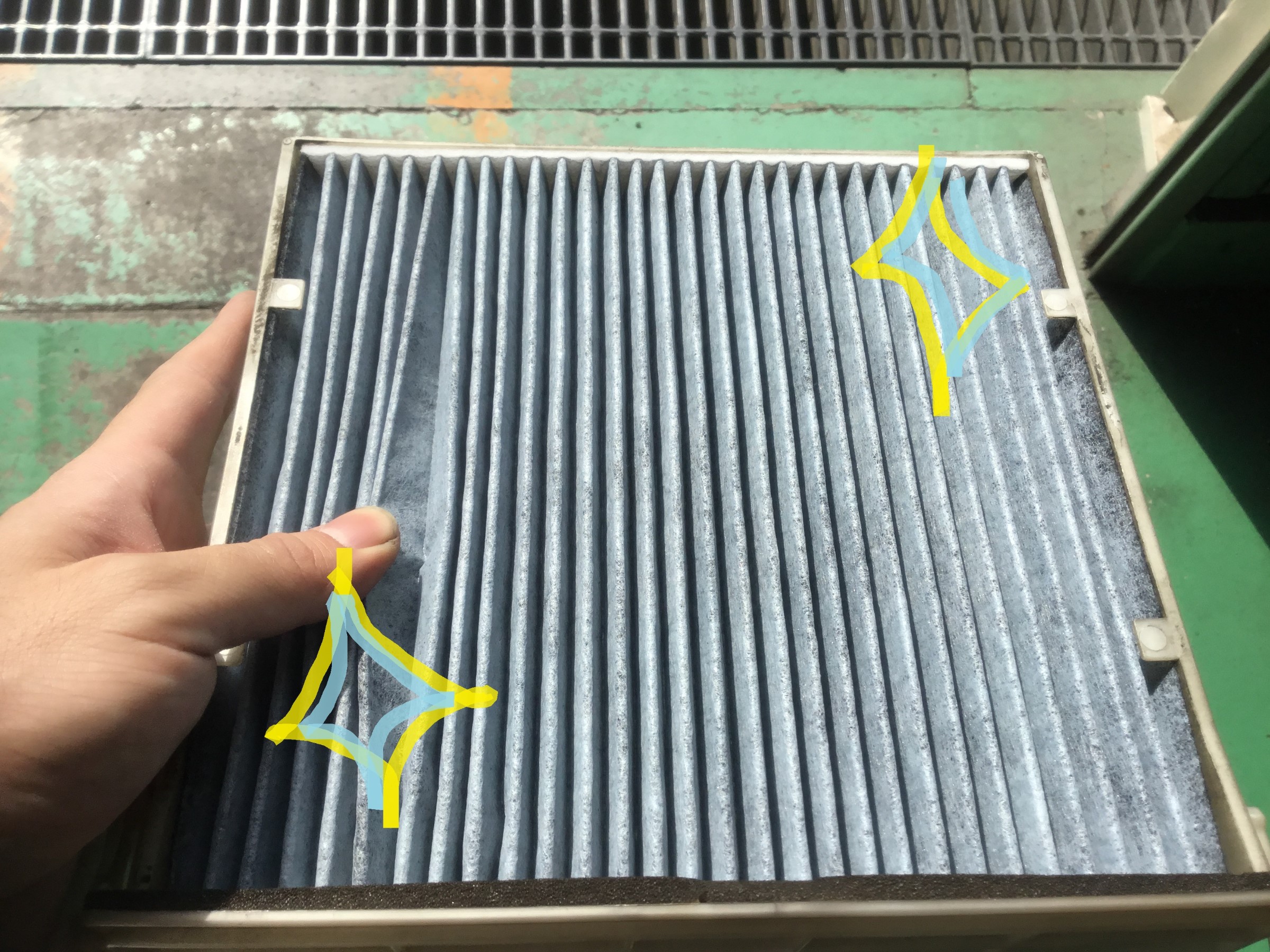 このようにホコリが詰まると風量が低下しますし、毎日乗る運転手は慣れてしまって気づかないことも多いですが異臭を発することもあります(;´∀`)