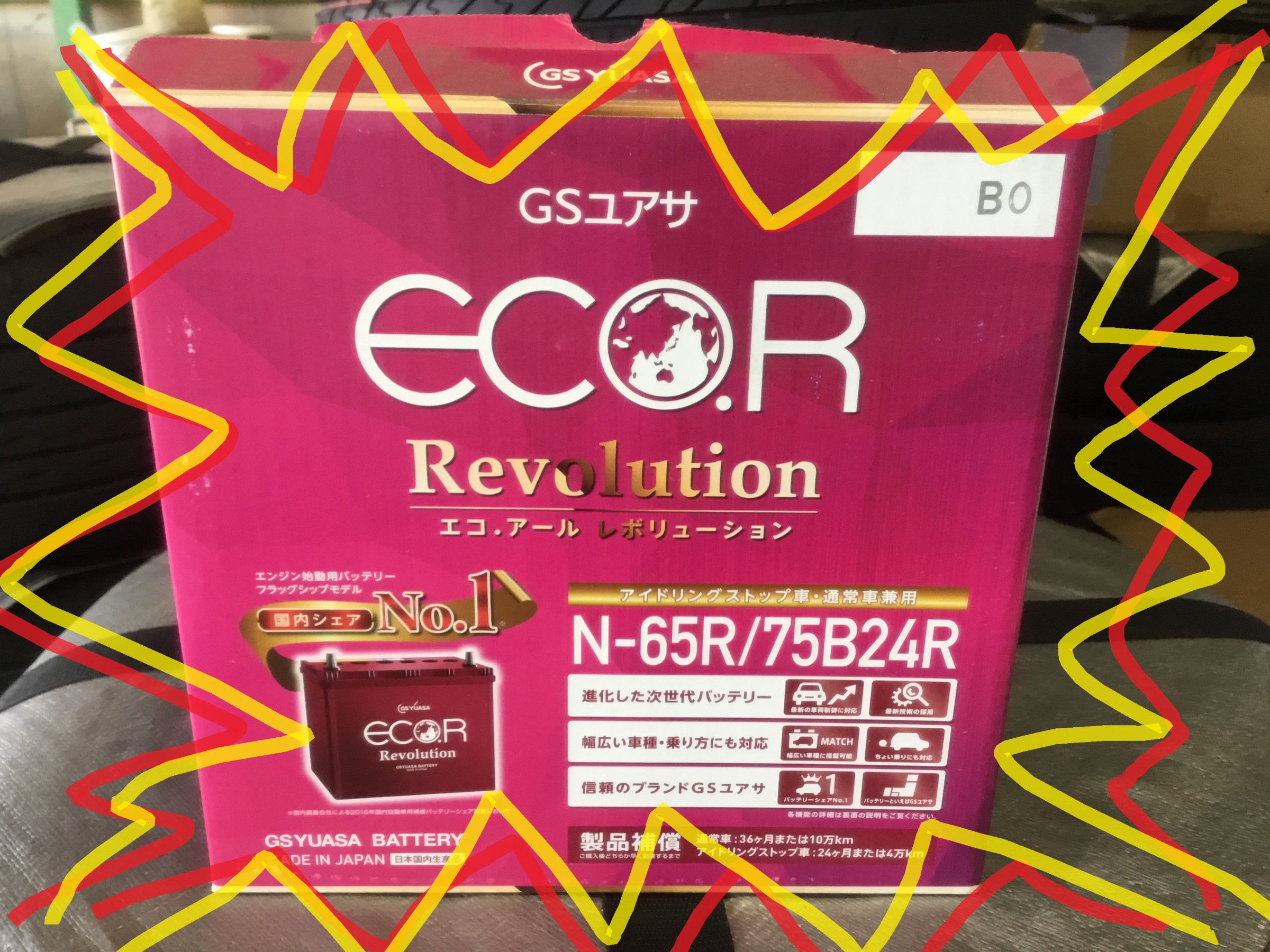交換バッテリーはGSユアサの最上級バッテリーであるエコR Revolution!!
