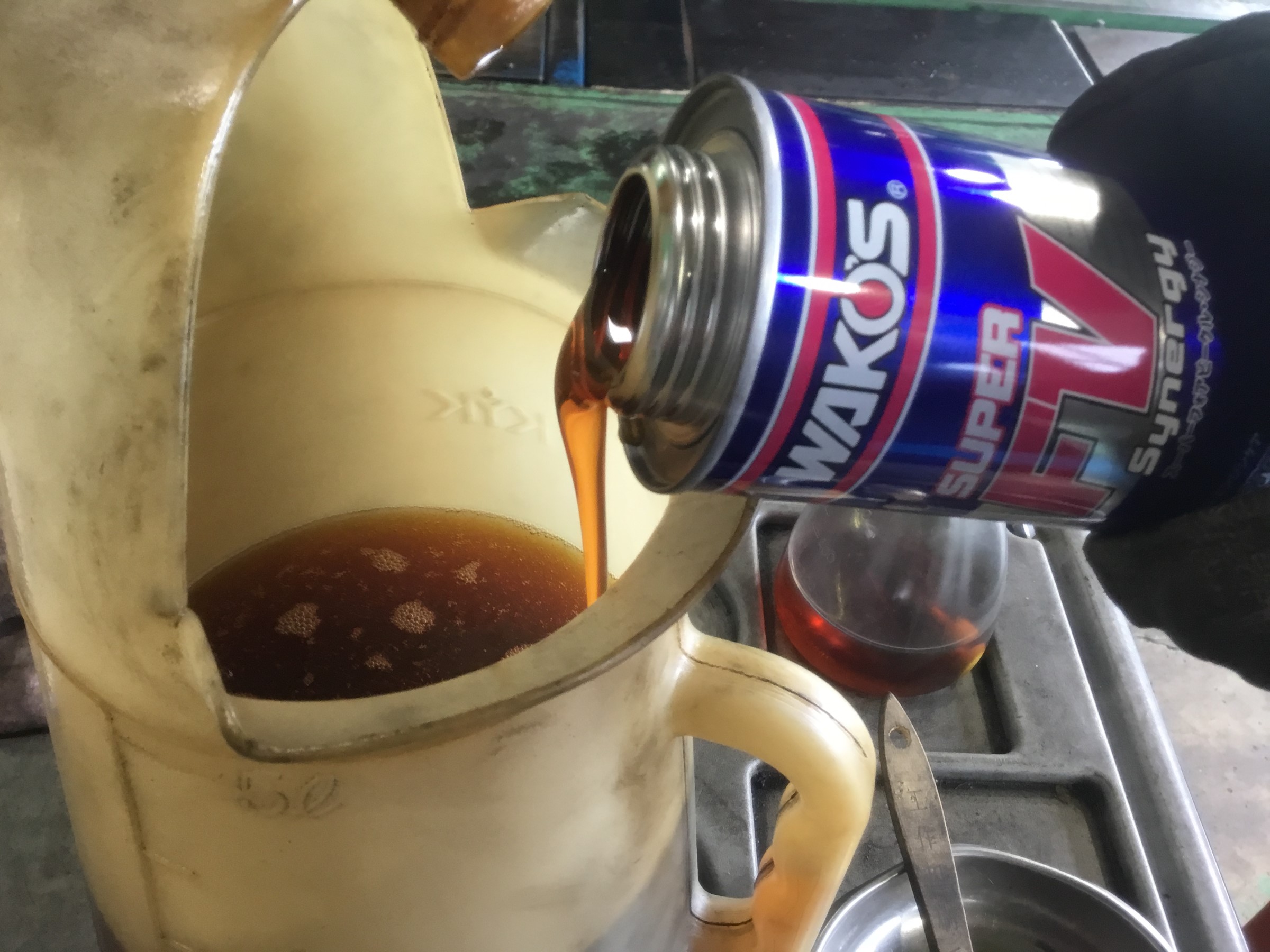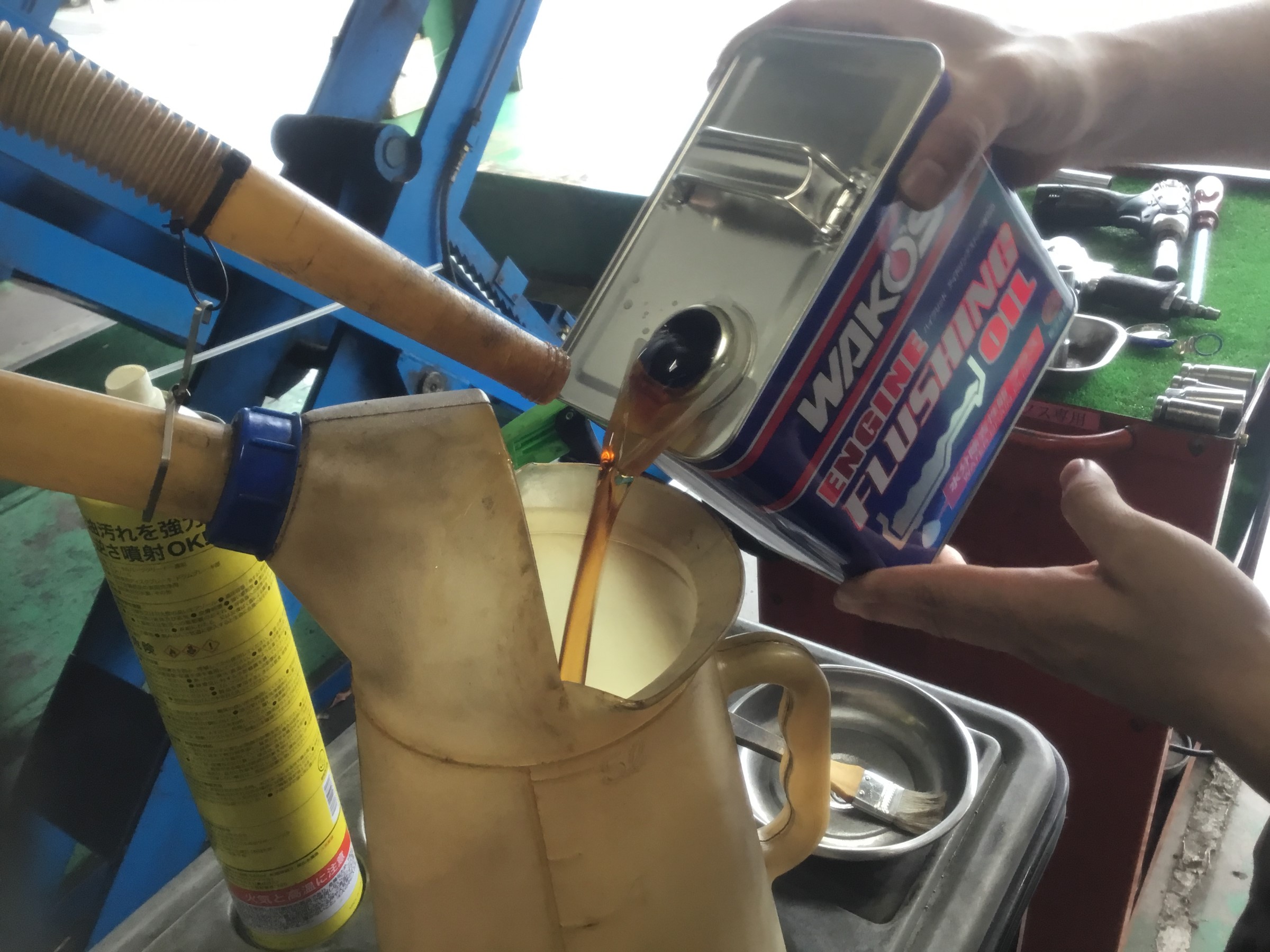 古いエンジンオイルを抜いてからこの綺麗な黄金色のWAKO’Sのエンジンフラッシングオイルを入れて30分間アンドリングさせると、エンジン内部にべっとりとこびりついた汚れをしっかり溶かし出してくれるんです(´⊥`*)