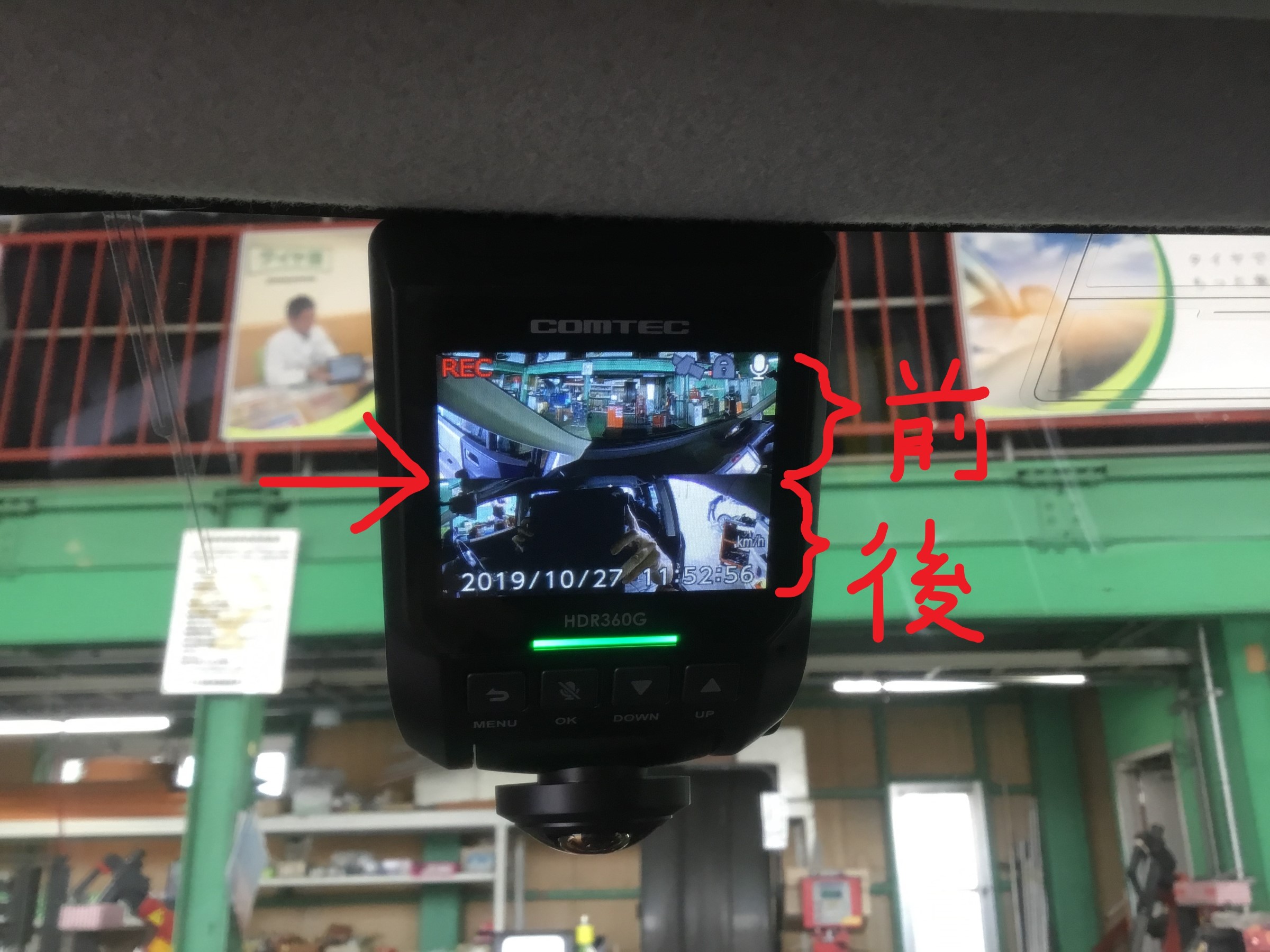 矢印の部分で上下に画面が分かれていて、上は前方で下は後方を映しています!