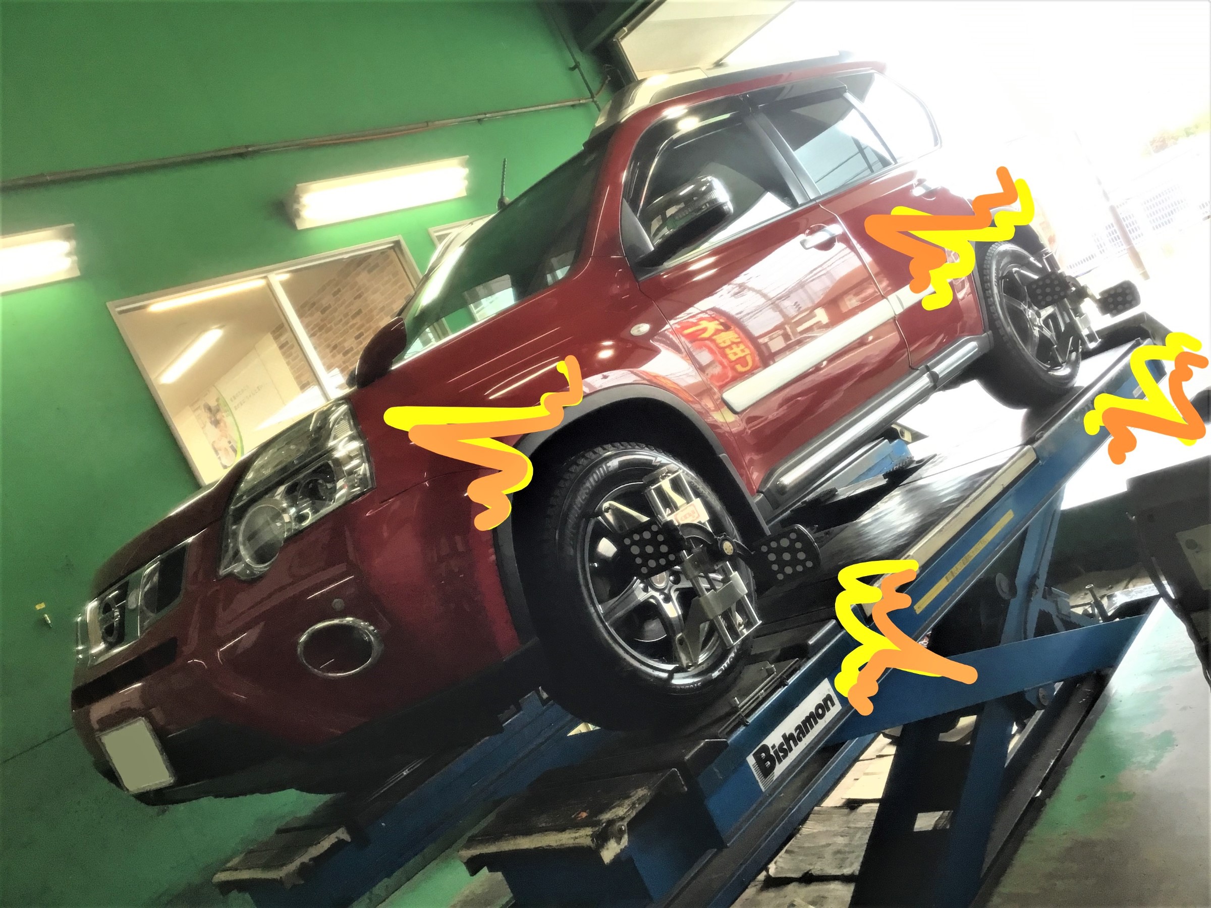 DNT31型エクストレイル、スタッドレスタイヤ&アルミホイールセット取り付け&アライメント調整!