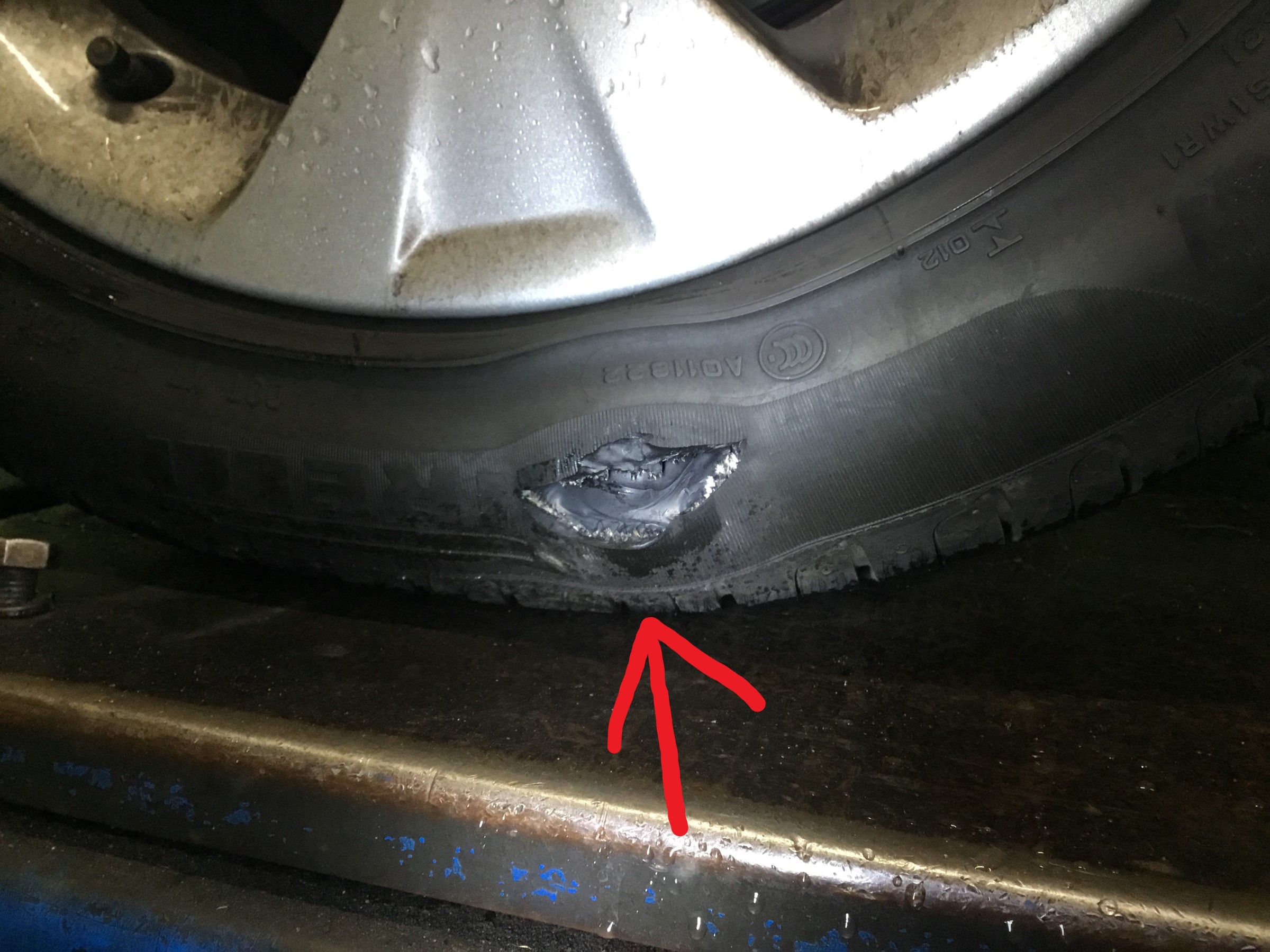通常のタイヤなら間違いなく破裂しているレベルの深さの傷なのに、破裂寸前で耐えている・・・!!
