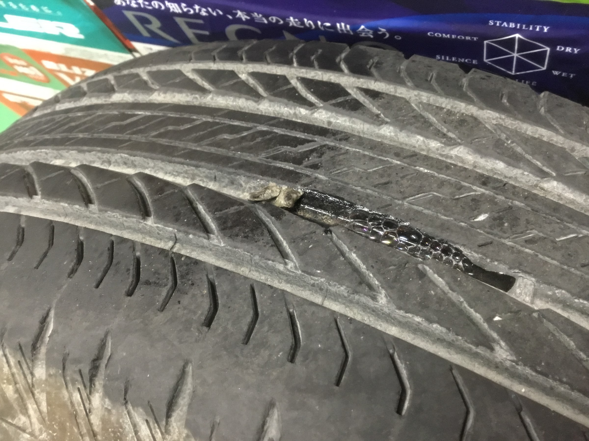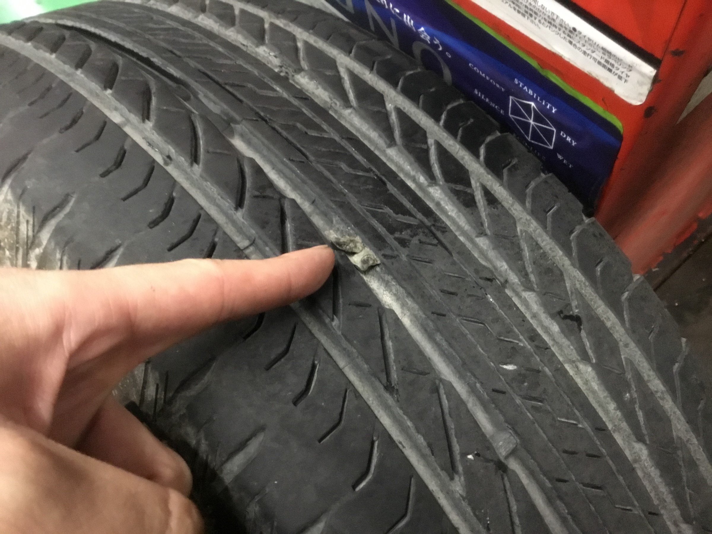 このタイヤは外からプラグを打ち込んで修理されたようですが・・・
