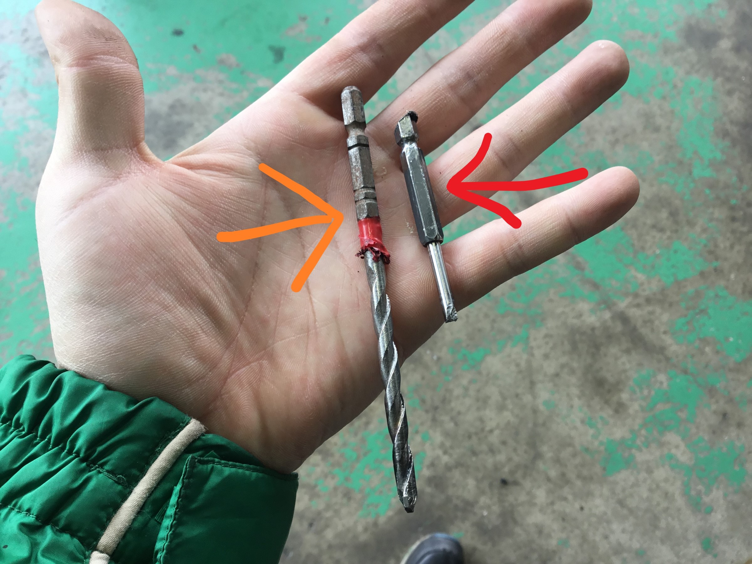 右の赤矢印のが刺さっていたブツでして、左の黄色矢印のが当店の仕事で使っているドリル刃!