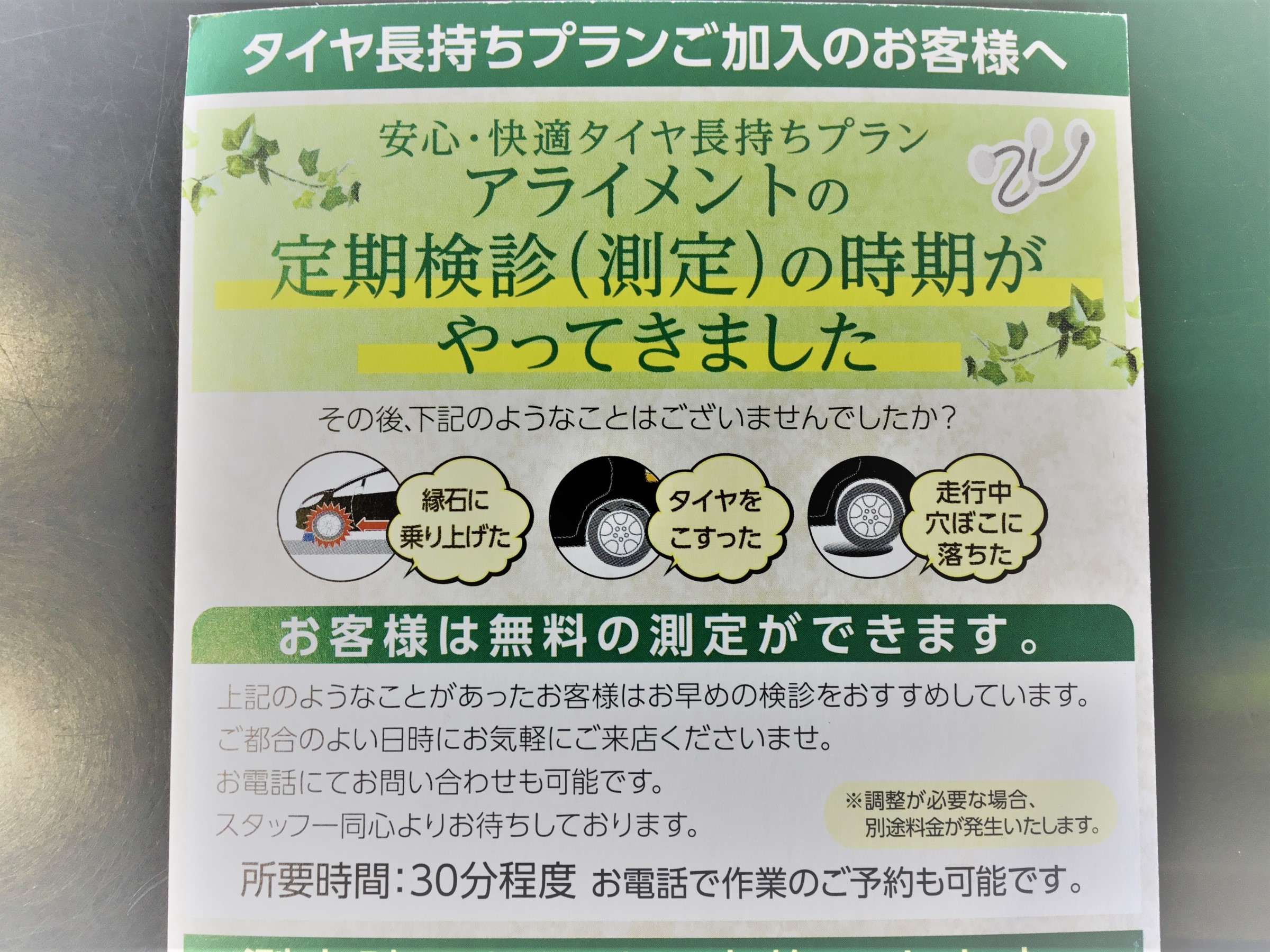 ズレがあれば有料での調整になりますが、毎年しっかりタイヤの角度を調整してタイヤを長持ちで使って頂きたいというタイヤ館の願いから生まれたプランなんです!(っ´∀`)っ 本来は測定のみでも料金が発生するのでかなりお得です!