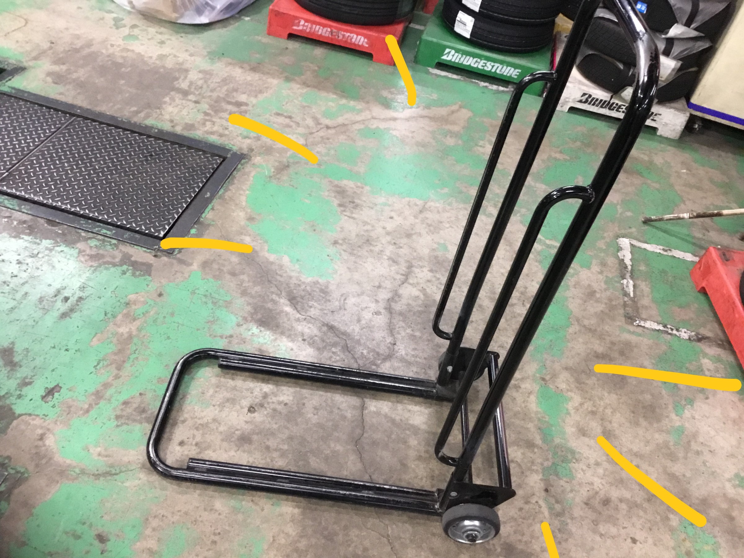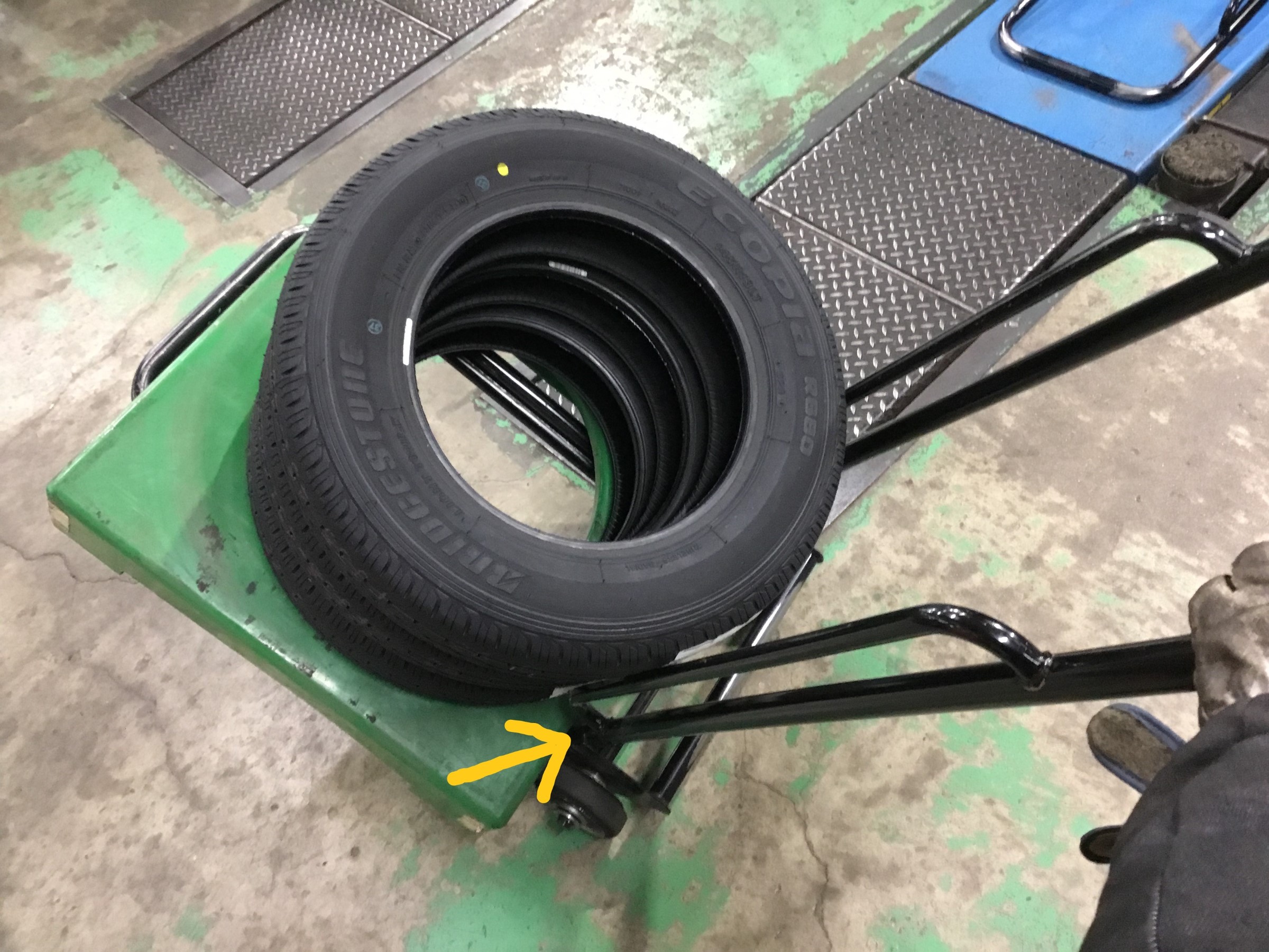 こーやってタイヤの下に差し込んでテコの力で傾け、角にはホイールがついているので重たいタイヤを大量にスイスイ運べる便利なキャリーなんです(=゚ω゚)ノ