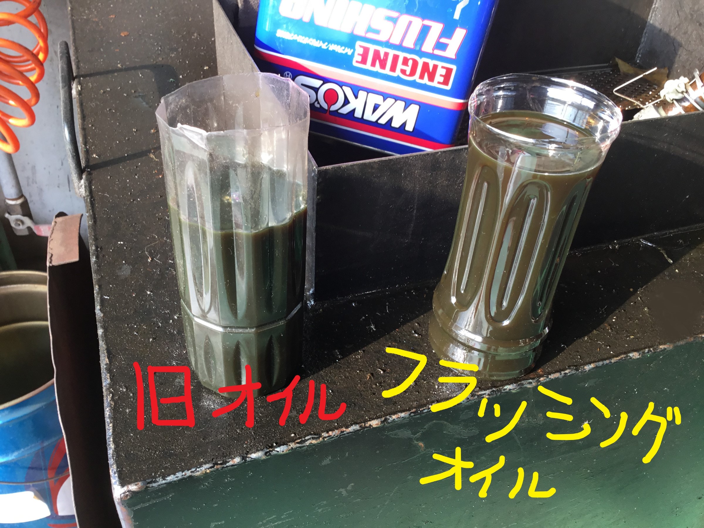 左が今まで使用していたオイルを抜いたもので、右が使用後のフラッシングオイル!