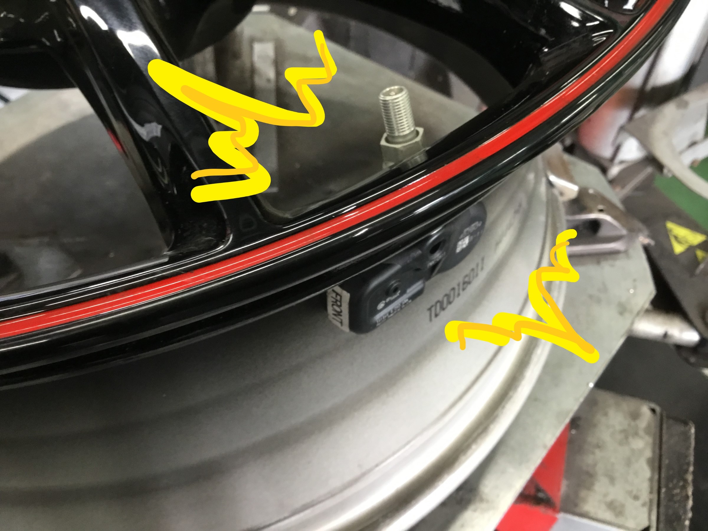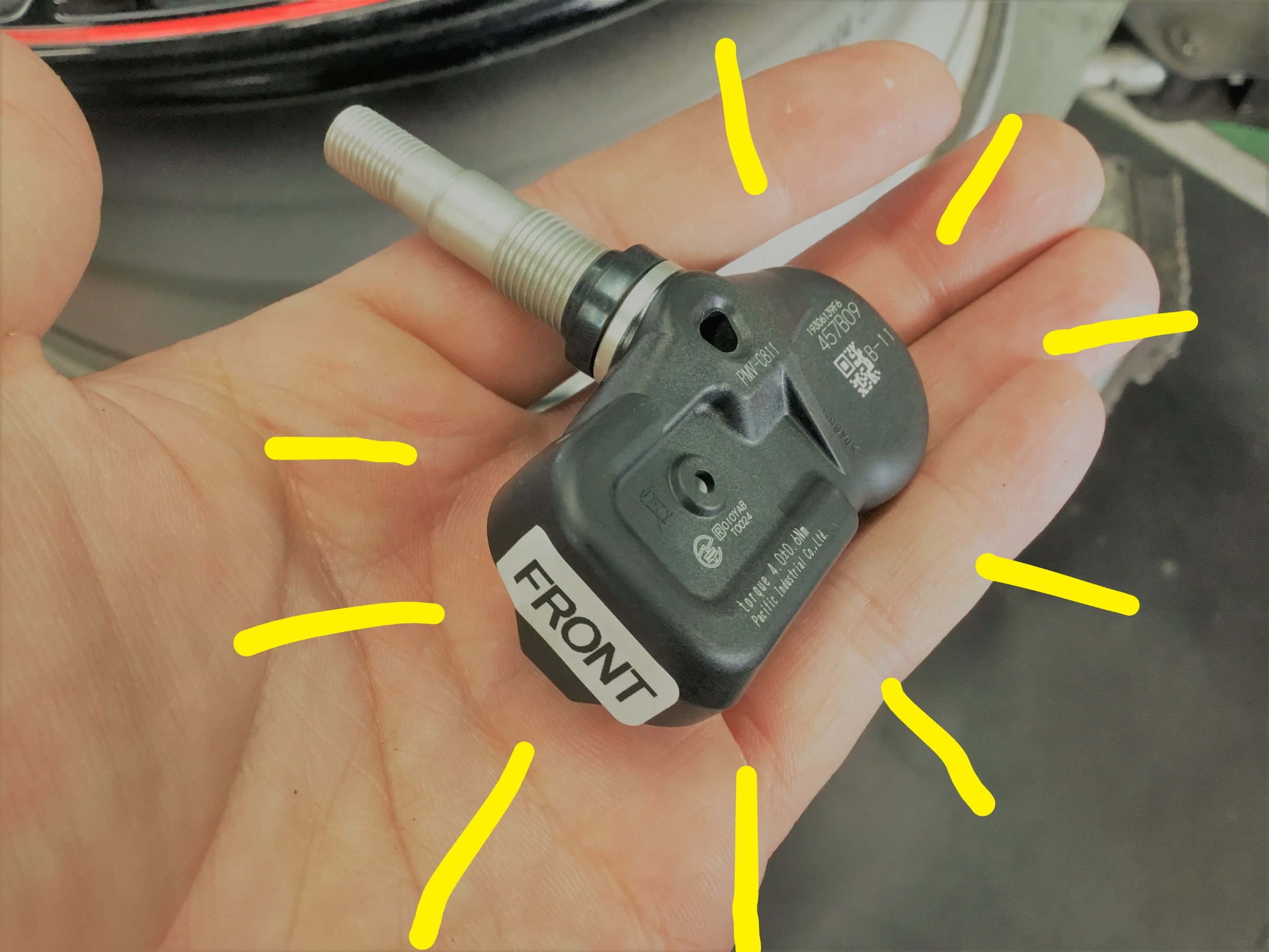 このようにホイールに組みこまれ、黒いセンサー部はタイヤ内部に隠れ、銀色のエア注入口はホイールのエアバルブ用の穴から外に出ます( ^ω^ )