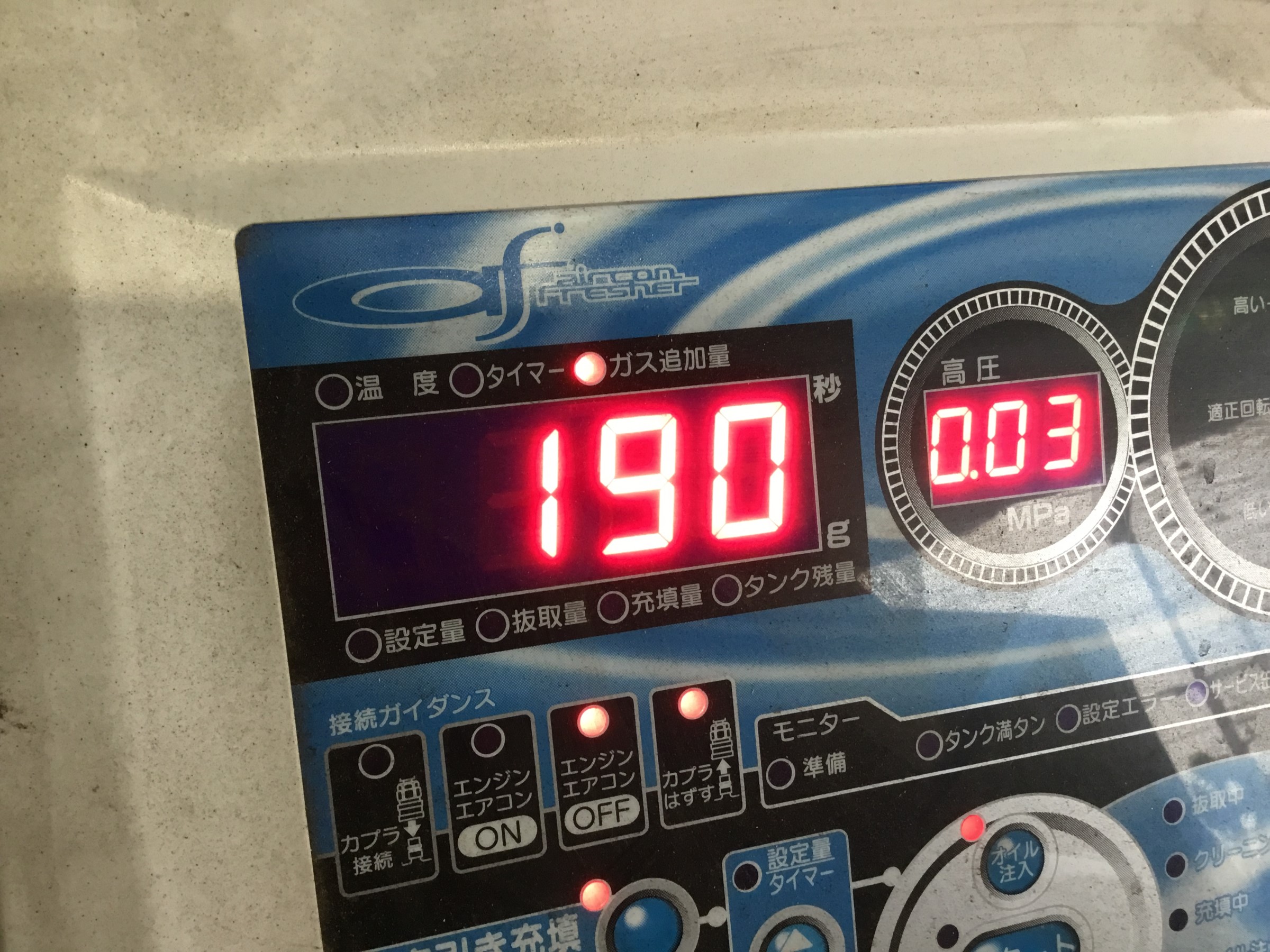 このMOVEは300gのエアコンガス量が正常なのですが、ほぼ1/3の110gしか入っておらずに190gの追加となりました!(;^ω^)これは冷えが変わるはず!!