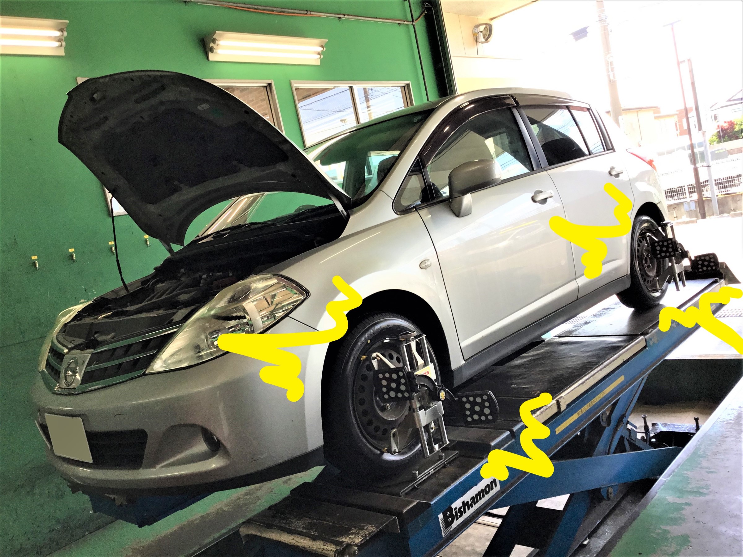 C11型ティーダ、タイヤ交換&アライメント調整&ブレーキランプ交換!