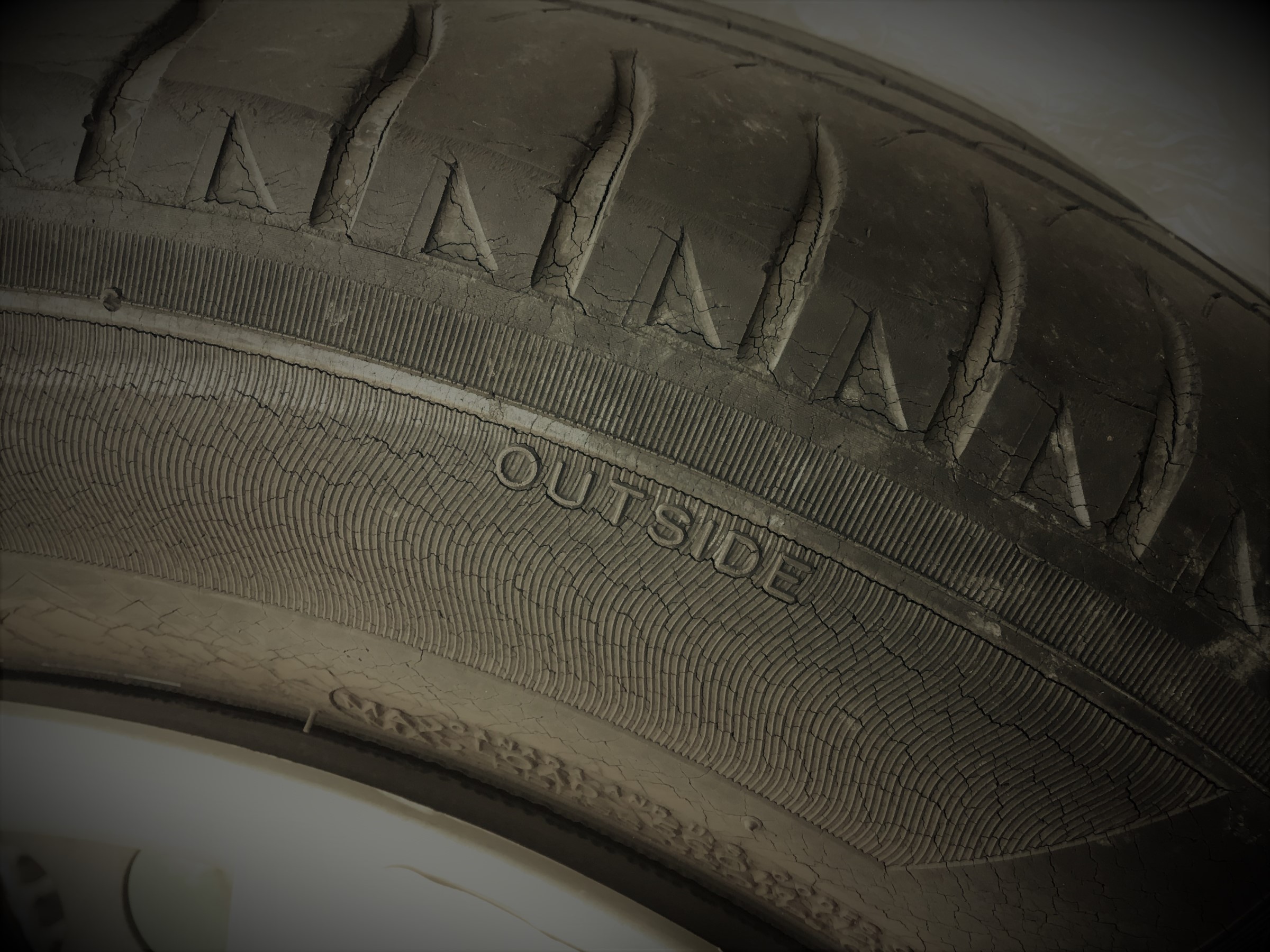 今まで使用されていた夏タイヤは2015年製で、経年劣化でタイヤ全体にひび割れが・・・!!((((;゚Д゚))))