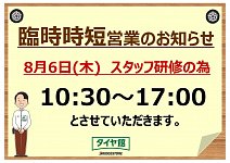 明日8月6日(木)の営業時間に関してのお知らせ!!