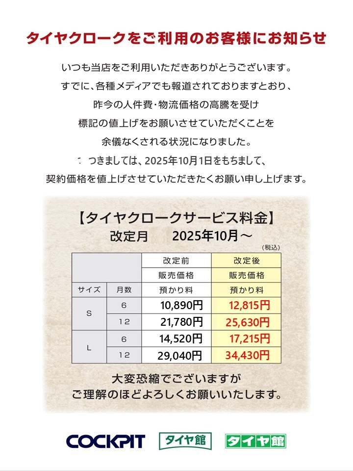 タイヤクロークサービス料金改定のお知らせ【2025年10月1日より値上げになります】